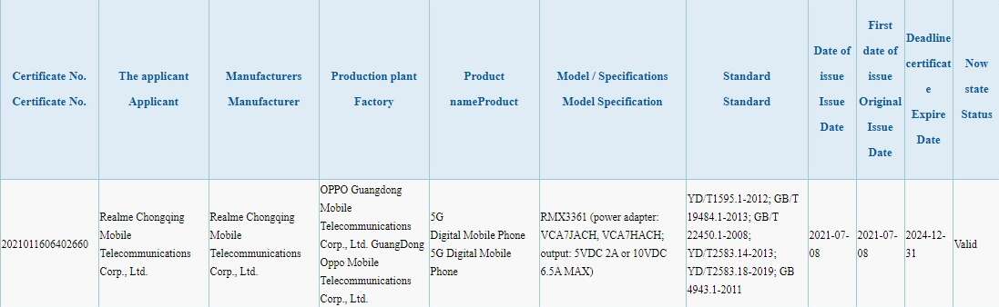 Certyfikat TENAA zdradza nam jego 6,43-calowy wyświetlacz AMOLED, baterię o pojemności 4200 mAh z obsługą ładowania o mocy 65 W (za pomocą ładowarki o numerze modelu VCA7HACH) oraz wymiary równe 159,2 x 73,5 x 8,0 mm. Ponadto smartfon będzie działać pod władzą systemu Android 11 wraz z nakładką graficzną Realme OS 2.0.