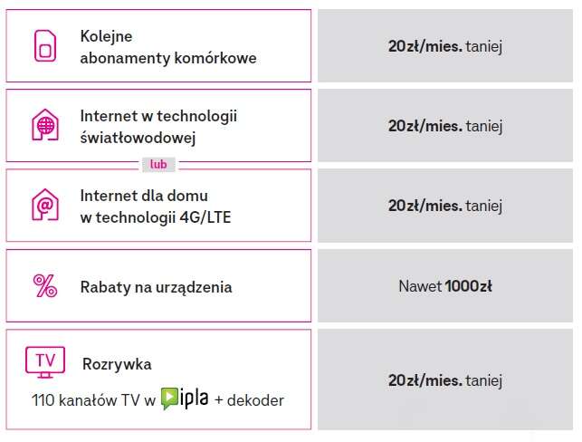Jednak w ramach „Korzyści dla domu” przewidziane są rabaty. Posiadacze abonamentu komórkowego w T-Mobile (z wyjątkiem oferty XS) lub ci, którzy zakupią ofertę abonamentu komórkowego wraz z nielimitowanym internetem domowym te same prędkości otrzymają w cenie niższej o 20 zł.