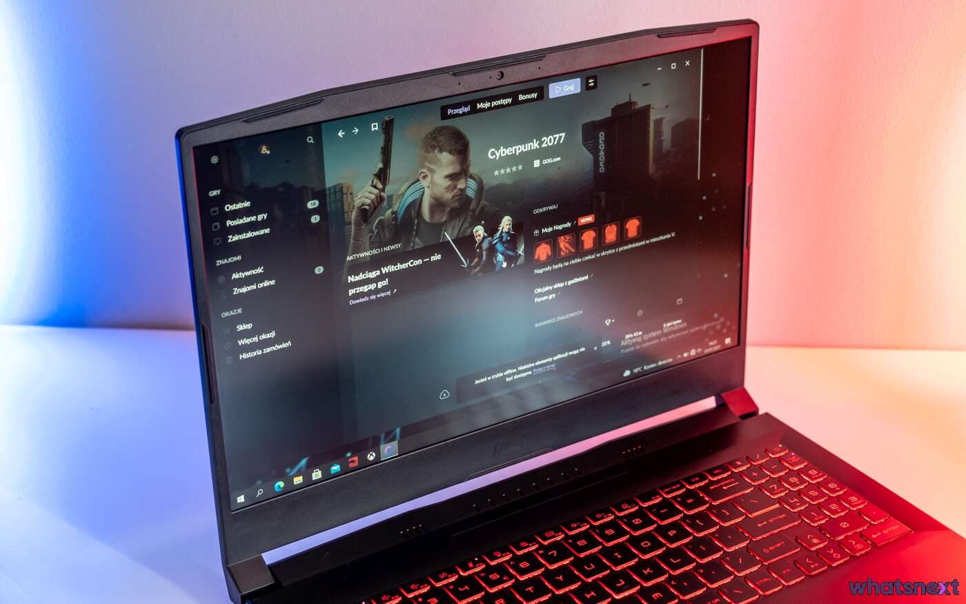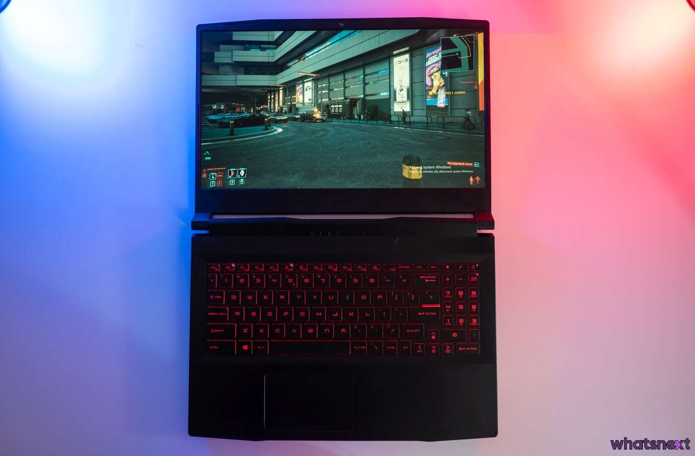 Sprawdziłem też wstępnie jak MSI Katana GF66 sprawuje się w Cyberpunk 2077. Przy ustawieniach Ultra bez RT czy DLSS uzyskałem średnio 54 fps, więc wynik jest całkiem niezły. Jeśli celujecie w 60 fps to wystarczy włączyć DLSS albo lekko obniżyć detale i gra będzie Wam w pełni płynnie śmigała. Całość niestety robiła się dosyć głośna i gorąca, więc polecam od razu zakupić słuchawki z porządnym wyciszeniem i raczej nie liczyłbym na możliwość trzymania laptopa na kolanach.