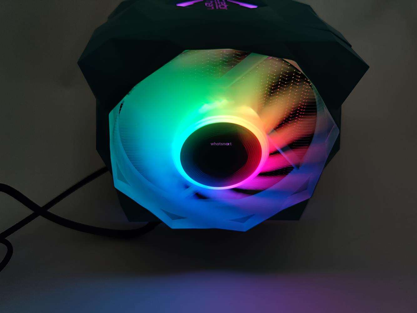 Za chłodzenie odpowiadają dwa wentylatory: 120 mm i 140 mm. Ten pierwszy ma maksymalną prędkość równą 1850 RPM, przepływ powietrza 76 CFM i ciśnienie 2,8 mmH2O. Drugie śmigło pracuje z maksymalną prędkością 1600 RPM. Wtedy też przepływ powietrza wynosi 96 CFM, a ciśnienie 2,65 mmH2. Głośność całego chłodzenia wynosi maksymalnie 38 dBA. Z wentylatorów wychodzą kable 4 pin PWM + z jednego dodatkowy ARGB do sterowania podświetleniem. Warto też zauważyć, że jeśli sygnał PWM jest poniżej 21% to całość pracuje pasywnie.
