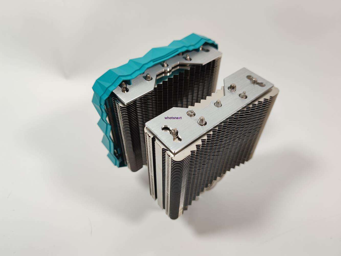 Chłodzenie ma siedem 6 mm ciepłowodów, które łączą się podstawką wykonaną na lustro. Ilość finów to 98 sztuk i mają grubość 0,4 mm. Sam cooler ma wymiary 135 x 150 x 166 mm, więc potrzeba do niego dosyć sporej obudowy. Waga wynosi 1158 g. Warto tutaj zwrócić uwagę na przedni wentylator, który będzie nachodził na pamięci RAM. Ich wysokość nie może więc przekroczyć 45 mm. Sama jakość wykonania wydaje się dobra, ale najsłabiej wypada obudowa całości, która jest plastikowa. Mam tutaj wrażenie, że po kilku montażach zaczepy mogły by przestać trzymać boki.