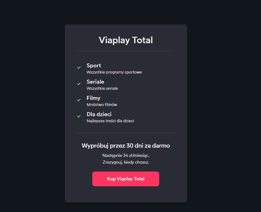 Zakładając konto w serwisie otrzymujemy 30 dni darmowego dostępu. W tym czasie spokojnie można zapoznać się z ofertą i sprawdzić, czy platforma nam odpowiada. Po tym czasie miesięczna opłata wynosi 34 zł. Trochę dużo, zważywszy, że obecnie tylko Netfliks każe tyle płacić za pojedyncze konto. Ma jednak o wiele atrakcyjniejsze oferty współdzielonych subskrypcji, a Viaplay nie. Przy aktualnej ofercie raczej bym się nie zdecydowała kontynuować subskrypcji.