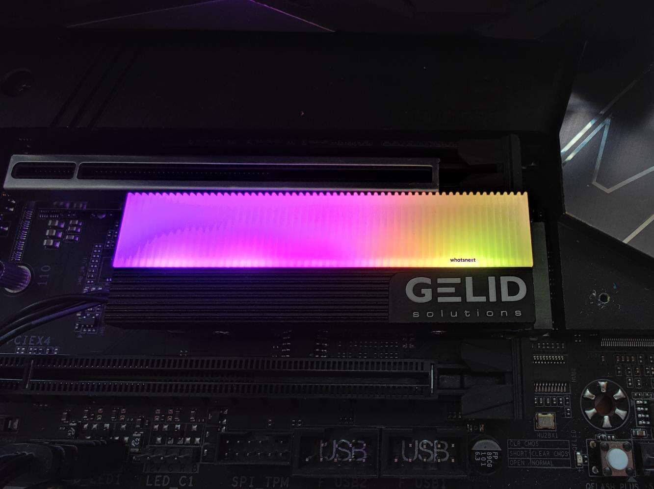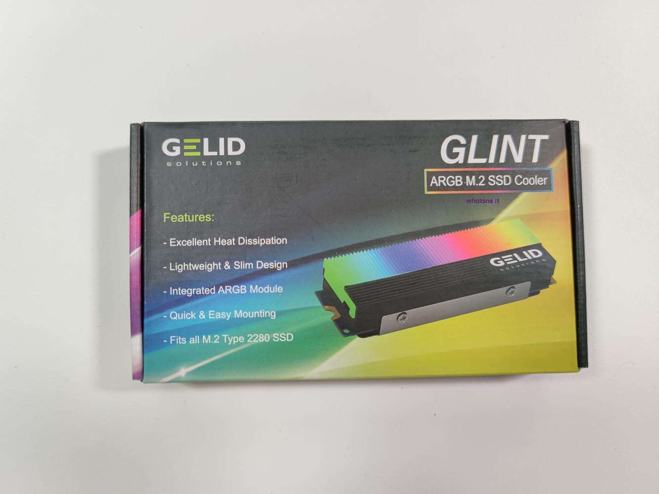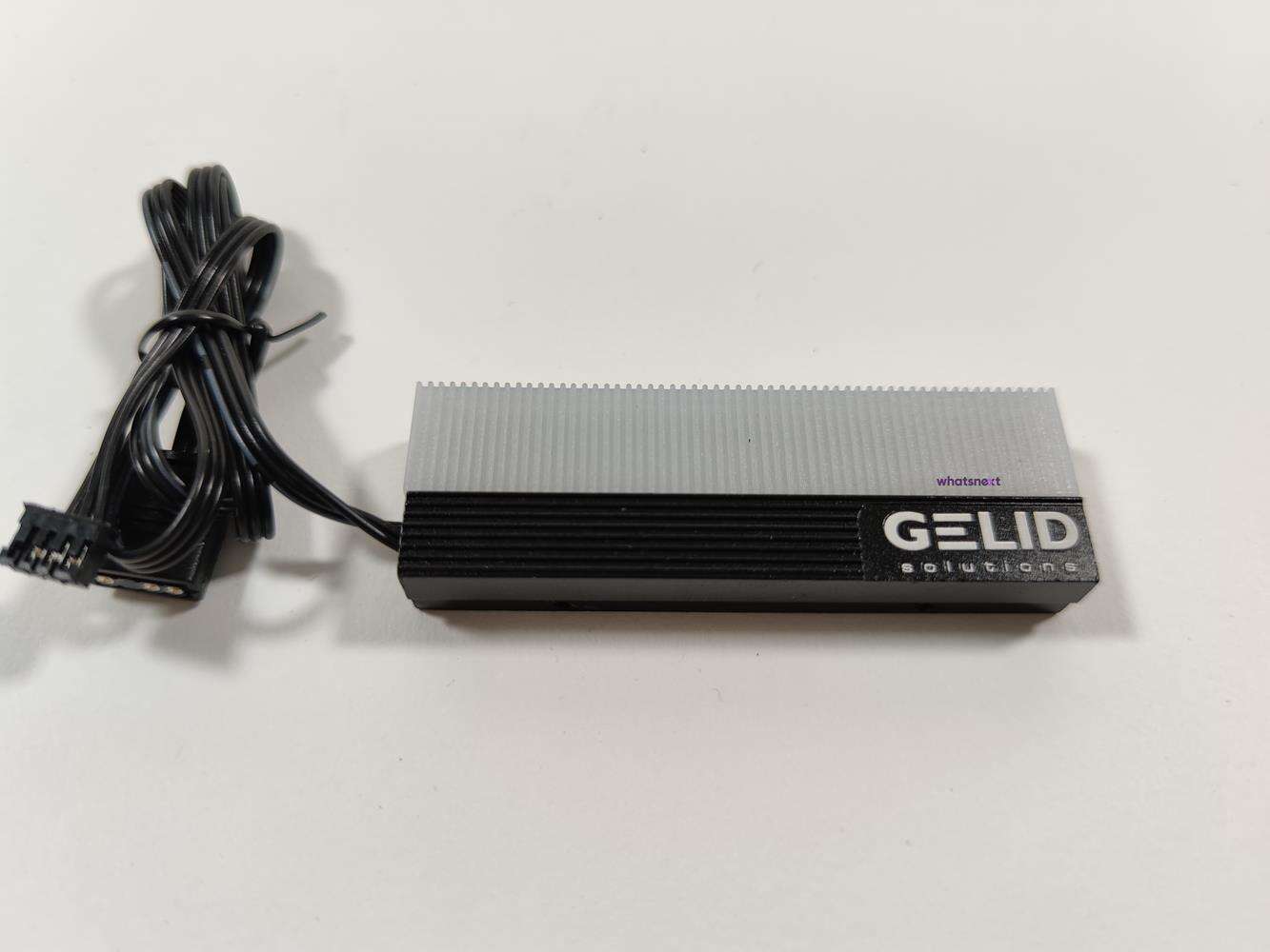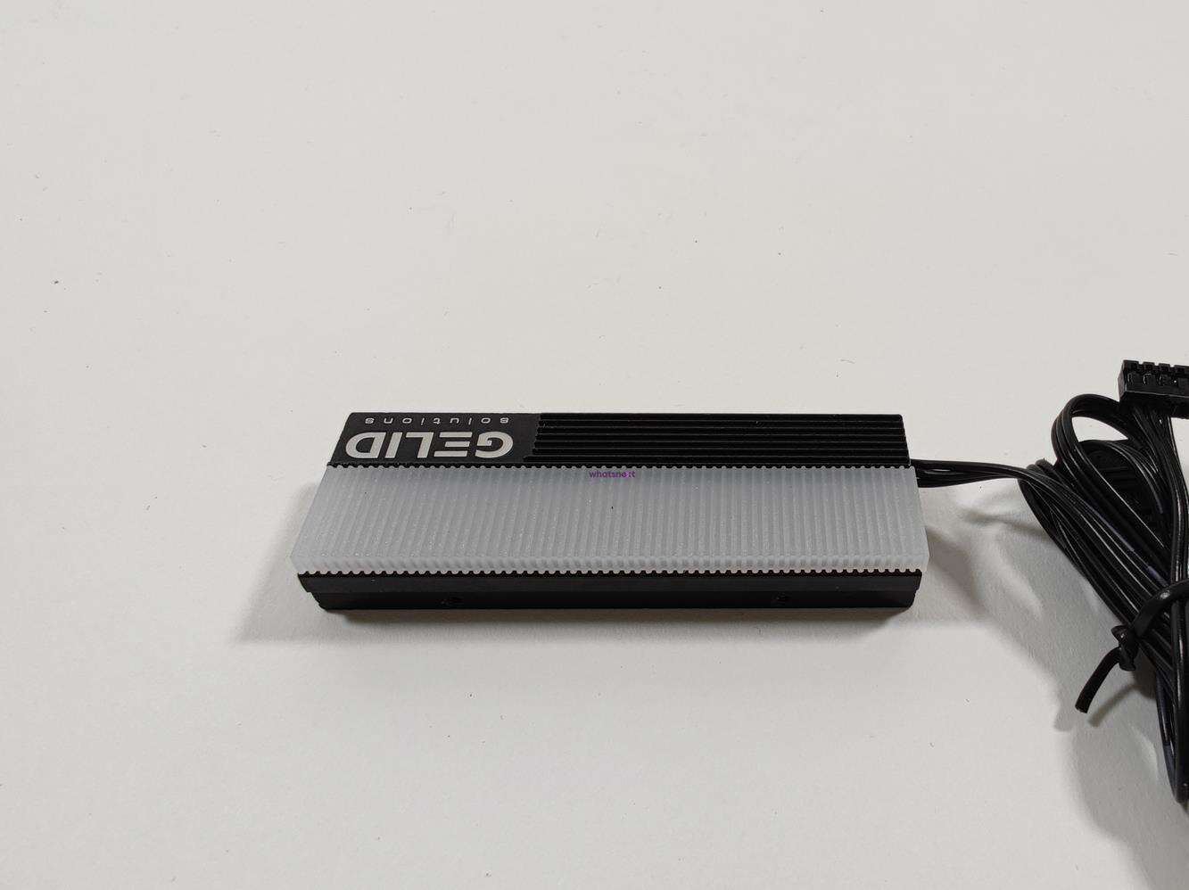 Całość składa się z dwóch części – dolnej blaszki i radiatora. Dysk jest więc chłodzony od góry i od spodu. Radiator ma wymiary 73 x 24 x 15 mm. Waży on 53 g. Radiator ma 5 diod LED, które oferują podświetlenie ARGB. Z Gelid Glint wychodzi przewód ARGB oraz dodatkowy 3 pin. Spokojnie więc możecie zsynchronizować podświetlenie z dowolną płytą główną obsługującą 3 pinowe wtyczki ARGB. Warto też pamiętać, że chłodzenie jest zgodne tylko z dyskami 2280.