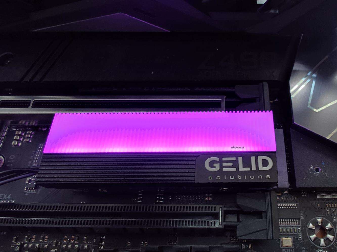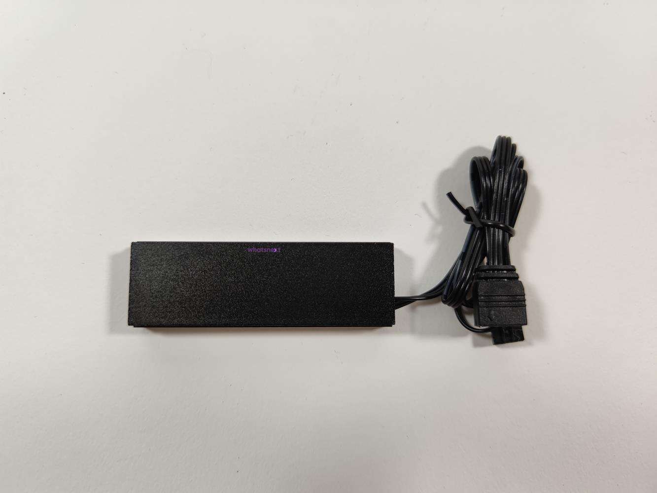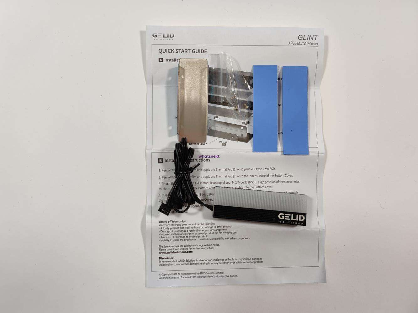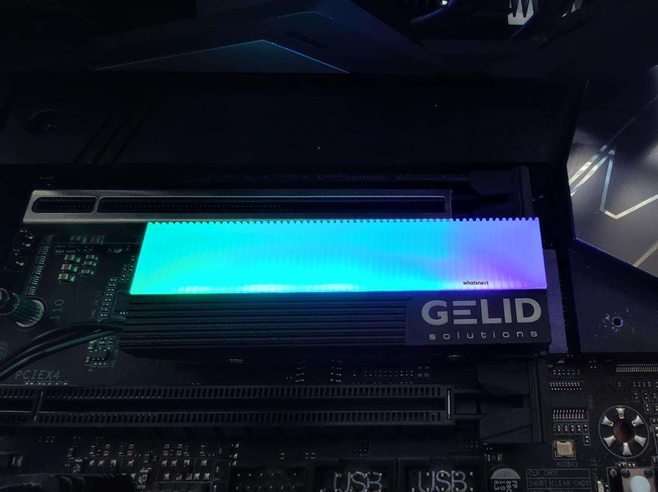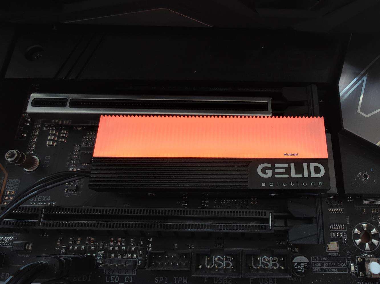 Całość składa się z dwóch części – dolnej blaszki i radiatora. Dysk jest więc chłodzony od góry i od spodu. Radiator ma wymiary 73 x 24 x 15 mm. Waży on 53 g. Radiator ma 5 diod LED, które oferują podświetlenie ARGB. Z Gelid Glint wychodzi przewód ARGB oraz dodatkowy 3 pin. Spokojnie więc możecie zsynchronizować podświetlenie z dowolną płytą główną obsługującą 3 pinowe wtyczki ARGB. Warto też pamiętać, że chłodzenie jest zgodne tylko z dyskami 2280.