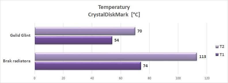 Spadek temperatur jest ogromny. Bez radiatora jeden z czujników notował nawet sporo ponad 100°C, po założeniu Gelid Glint spadek wyniósł ponad 40°C! Warto więc zdecydować się na montaż takiego radiatora, bowiem zdecydowanie jest widoczna różnica w zanotowanych temperaturach.