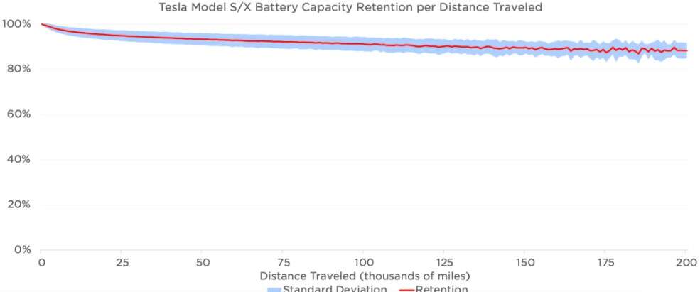 Wedle najnowszych danych Tesli akumulatory zainstalowane w Modelu S i Modelu X największe straty odnotowują przy pierwszych 160934 kilometrach, aby następnie zwolnić i ustabilizować się przez następne 160934 km. Finalnie po przejechaniu 321868 kilometrów spadek pojemności wynosi około 10%, co jest i tak świetnym wynikiem, bo według Tesli w przypadku USA średnio po takim przebiegu samochody w USA są złomowane, podczas gdy w Europie złomujemy ponoć szybciej, bo po przejechaniu ~241400 km.
