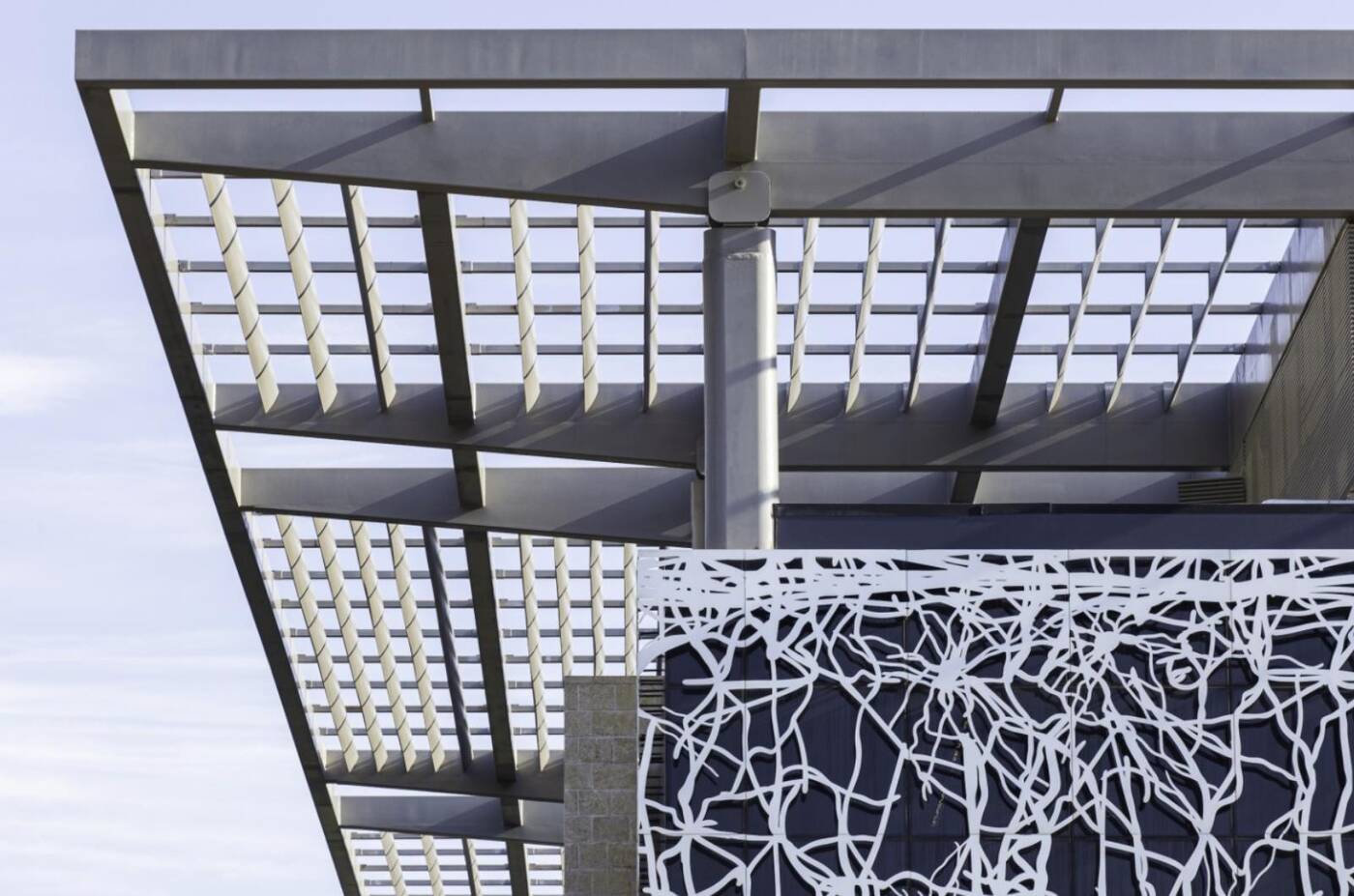 Tego typu „siatka nad oknami” zapewnia pasywne chłodzenie razem z półprzezroczystym zadaszeniu od zachodu i wschodu oraz specjalnie dobraną orientacją budynku. Jego wnętrze jest również rozplanowane z myślą o efektywności energetycznej, bo obejmuje dwa równoległe skrzydła, wokół wysadzanego drzewami centralnego dziedzińca. Ten ma ruchomy dach, którego można „zamknąć” zimą, aby zmniejszyć obciążenia grzewcze i odkryć latem, aby cieszyć się naturalną wentylacją.