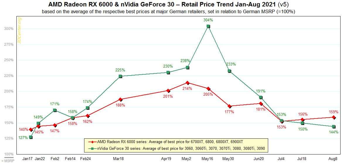 3DCenter.org przygotował nowe statystyki dotyczące rynku GPU. Wygląda na to, że najgorsze jest już za nami i powrotu do sytuacji sprzed kilku miesięcy już nie powinno być. Karty GeForce RTX 3000 w sklepach tanieją od maja i zanotowały w tym czasie 9% spadek cen. Co ciekawe Radeony drożeją od miesiąca i zanotowały 6% wzrost cen. Wszystko też wskazuje na to, że grafiki zielonych powinny nadal tracić na cenie, podczas gdy czerwonych stabilizować się lub lekko rosnąć. Ciekawe, czy te przewidywania rzeczywiście okażą się słuszne.