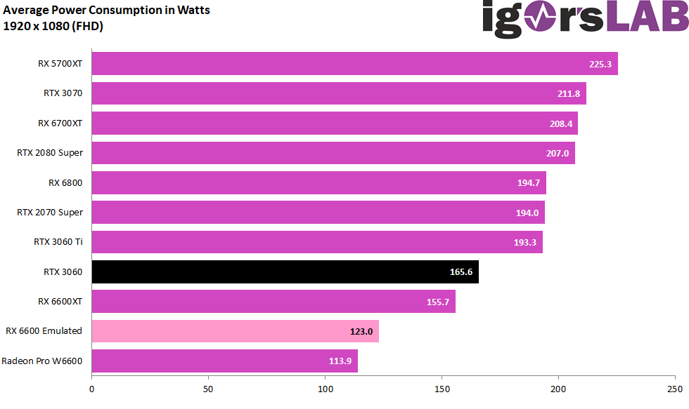 Nie jest to specjalnie dobry sposób, aby odpowiedzieć na pytanie, jaką wydajność zaoferuje RX 6600, ale lepszego na ten moment nie posiadamy. Finalnie więc karta przeznaczona na rynek profesjonalny została podkręcona tak, aby odpowiadać prawdopodobnemu poziomowi TDP 130 W (finalnie pobierała około 123 watów w grach), co oznaczało podbicie zegara bazowego do 2331 MHz, zegara Boost do 2580 MHz i pamięci do 16 GB/s.