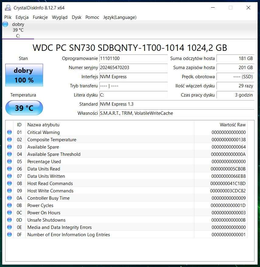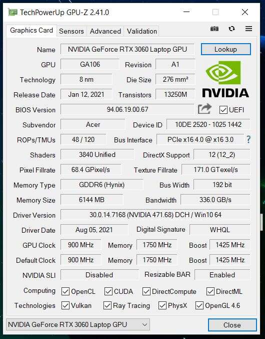 Zastosowany procesor to Intel Core i7-10750H. Jest to konstrukcja 6-rdzeniowa i 12-wątkowa o maksymalnej częstotliwości Turbo równej 5,00 GHz. Bazowa częstotliwość to 2,60 GHz. Karty graficzne jak zwykle są dwie – zintegrowana Intela oraz dedykowana Nvidia GeForce RTX 3060. Jej TGP to 105 W, a taktowanie boost 1425 MHz. Pamięć RAM to dwa moduły DDR4 2933 MHz każdy o pojemności 8 GB. Obecny jest też 1 TB dysk NVMe WDC PC SN730. Jest to oczywiście dysk PCI-E Gen3. Warto też pamiętać o obecności Intel Killer WiFi 6 oraz Bluetooth.