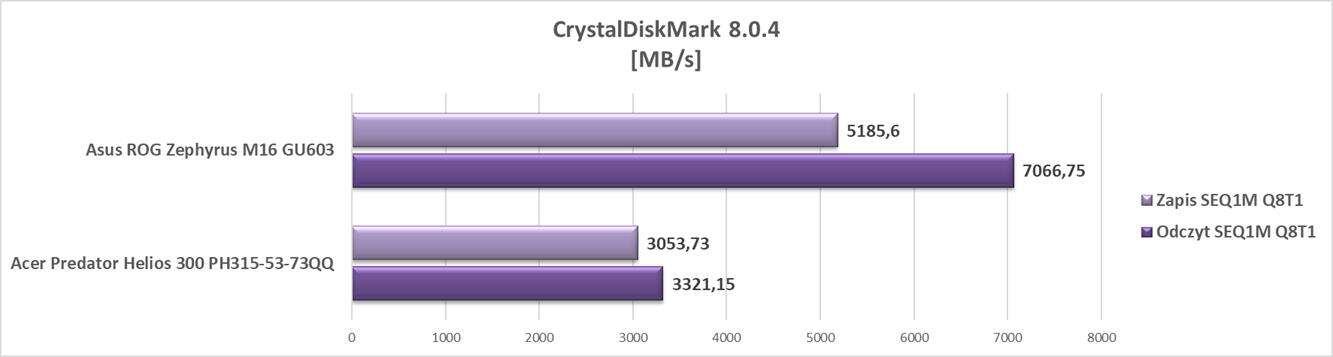 Wyniki są słabsze od konkurencyjnego laptopa, ale są odpowiednie jak na wykorzystaną konfigurację. Słabszy procesor jednak odstaje od mocniejszego wyższej generacji. Możecie więc liczyć na dobre wyniki w różnych zastosowaniach, choć nie będą one wyjątkowo wysokie. Dysk PCI-E Gen3 prezentuje dobrą wydajność. Także karta graficzna całkiem nieźle wypada w testach. Samo WiFi działa bez zarzutów – uzyskiwane prędkości pozwalają na wyciągnięcie 100% z mojego łącza.