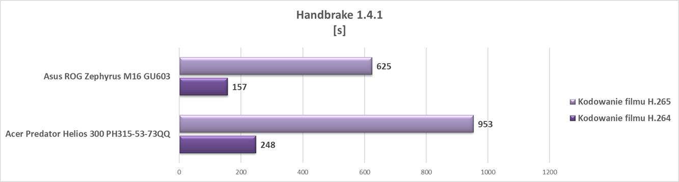 Wszystkie wersje programów znajdziecie na wykresach. W przypadku Handbrake sprawdziłem czas konwersji filmu .mp4 o długości 10 minut i 33 sekund do H.264 i H.265 (1080p30). W testach 3DMark wykorzystałem benchmarki dostępne w darmowej wersji programu.