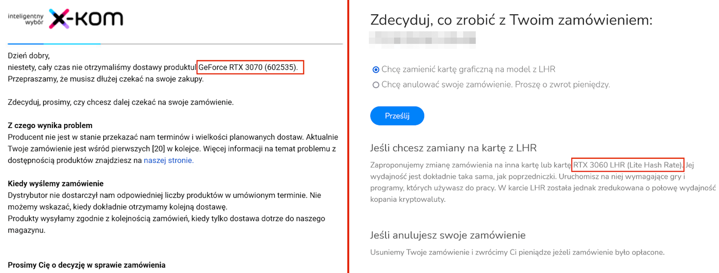 Tak właśnie postąpił autor wpisu w serwisie Instalki, który otrzymał właśnie od X-Komu wiadomość, że problemy z dostępnością kart graficznych zmuszają sklep do zmiany zamówienia, na które pozwalał przed prawie 9 miesiącami. Dlatego teraz X-Kom oferuje albo zwrot pieniędzy, albo zmianę modelu z pełnoprawnym rdzeniem na rzecz modelu z rdzeniem LHR, czyli ograniczającego wydajność kopania kryptowalut.