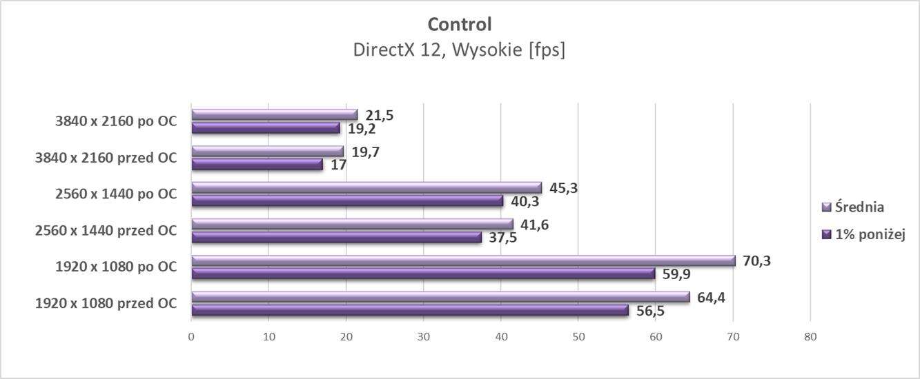 Jak sami widzicie już w pierwszej rozdzielczości nie we wszystkich grach zanotowałem średnio 60 fps. Karta też jest konkurencją bardziej dla RTX 3060 niż RTX 3060 Ti, choć są tutaj wyjątki jak np. AC Valhalla.
