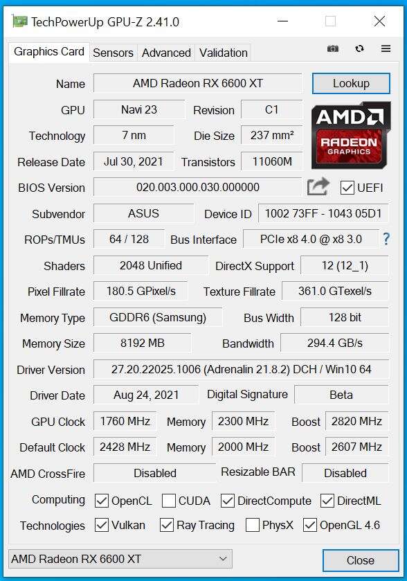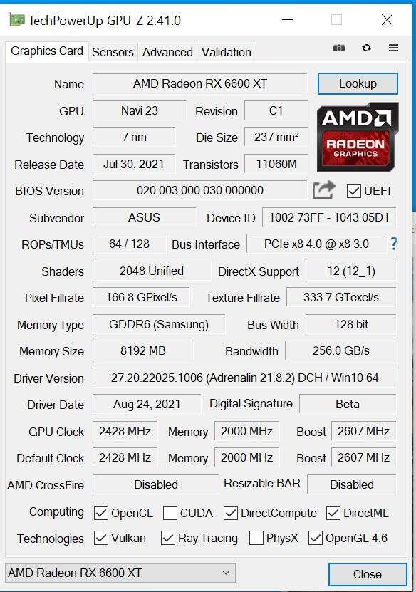 - RX 6600 XT: AMD Adrenalin 21.8.2