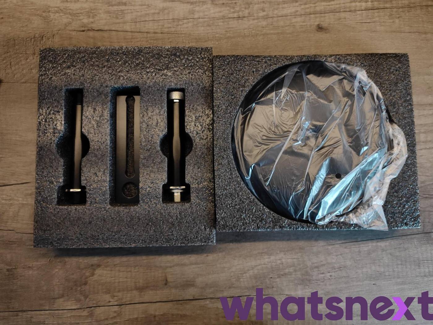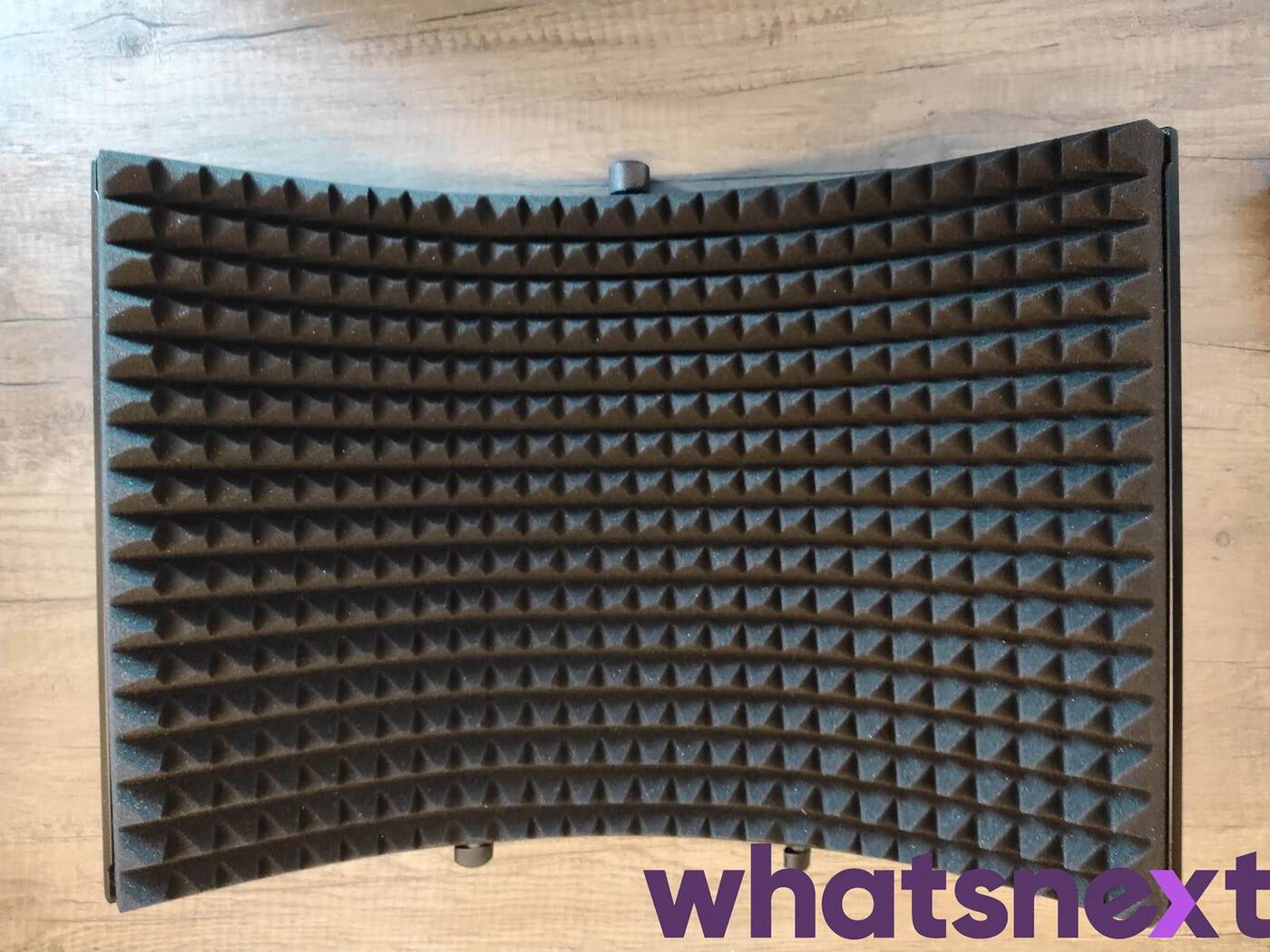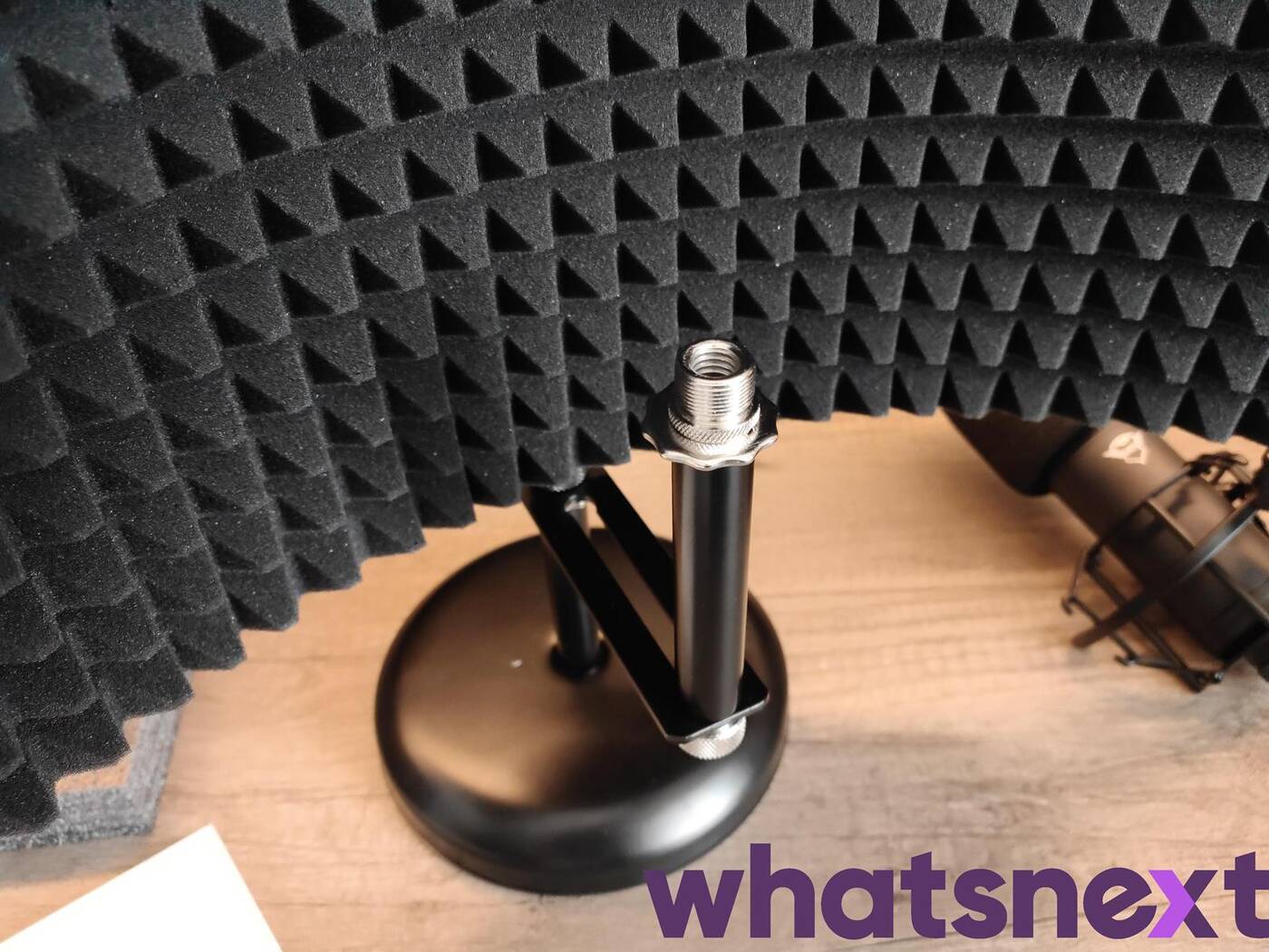 Tak ogromny, że to, co najważniejsze, czyli sam mikrofon, znalazł się w dodatkowym osobnym pudełku razem z najważniejszymi elementami montażowymi. Poza nim znajdziemy chyba głównego bohatera tego zestawu, czyli pokaźny panel z pianką akustyczną oraz kilka elementów montażowych, pozwalających zamontować wszystko na jednej solidnej podstawie, której gumowa powierzchnia na spodzie utrzymuje ją pewnie na blacie biurka. Przed zmontowaniem wszystkiego w całość koniecznie zajrzyjcie do instrukcji. Mówię o tym wcale nie dlatego, że sam do niej nie zaglądałem i finalnie skontrowałem jedną ze śrub, przykręcając inną, co finalnie wymagało interwencji klucza. Nie.