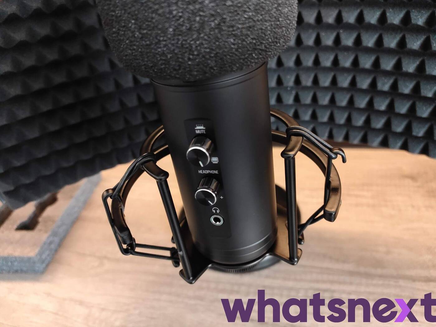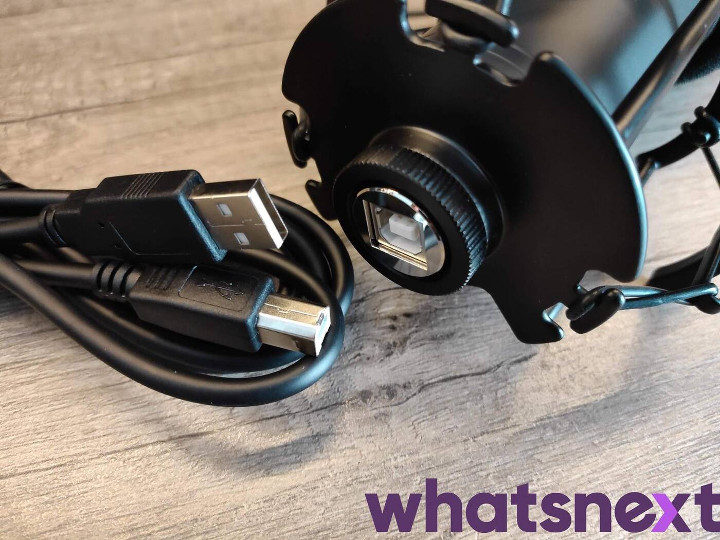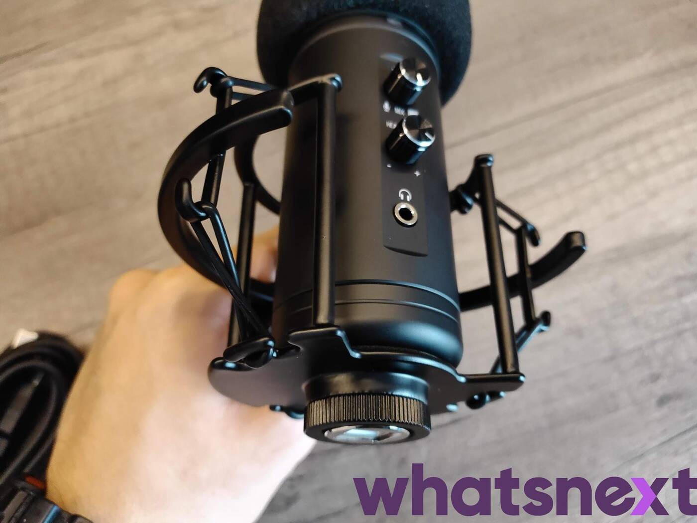 Chociaż można go z łatwością utrzymać w dłoni, to jest to zdecydowanie stacjonarny mikrofon, który składa się tak naprawdę z dwóch sekcji, z którymi mamy interakcję. Po pierwsze, w jego spód wpinamy przewód USB-B, co zapewne zrobimy tylko raz po jego zamontowaniu, a po drugie, na jego przodzie znajdziemy dwa potencjometry i wejście jack 3,5 mm.