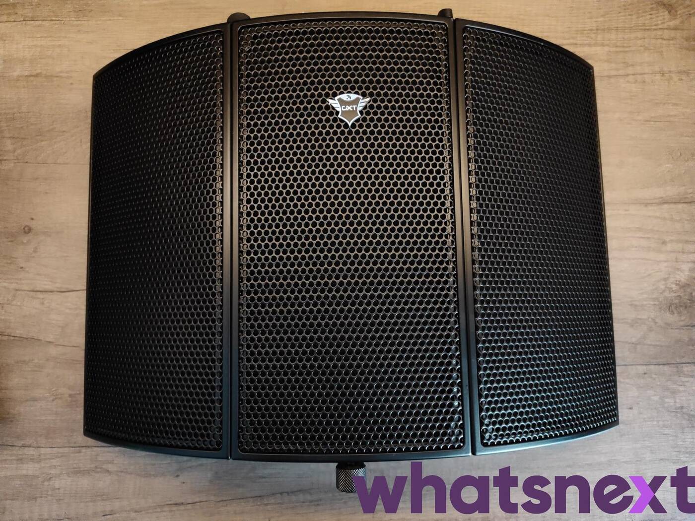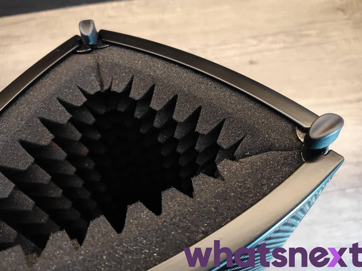 W zestawie Trust Rudox znajdziemy bowiem specjalny panel, otaczający tył mikrofonu, który składa się z metalowej podziurkowanej ramki i tradycyjnej pianki wyciszającej. Jej rolą jest niwelowanie fal dźwiękowych, które ominą mikrofon i w najgorszym przypadku odbiją się od np. ściany, czy monitora i powrócą z powrotem do membrany, obniżając ogólną jakość dźwięku.