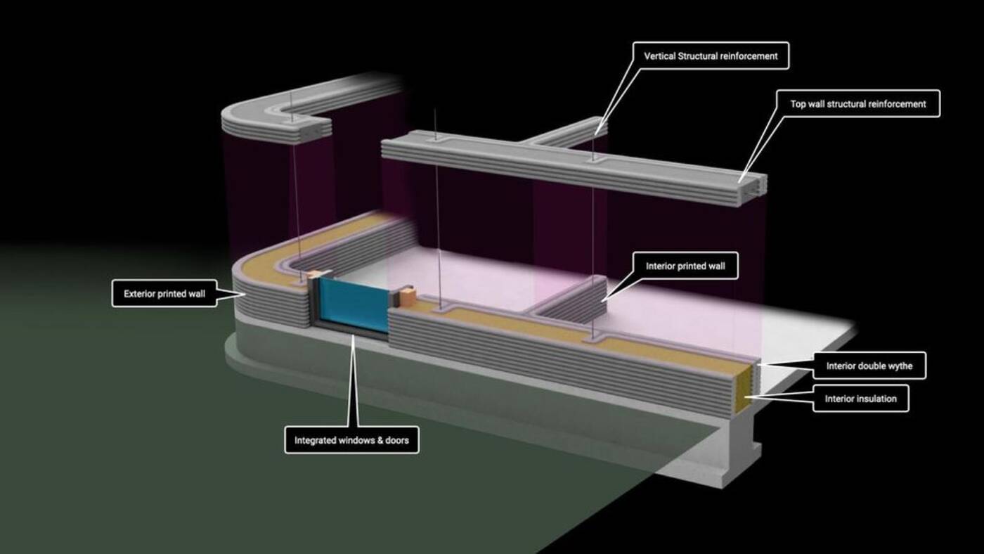 W tym procesie pierwsze skrzypce grała ogromna maszyna, która drukowała ściany baraków „warstwa po warstwie” z wykorzystaniem mieszanki betonowej. Przekrój projektu baraków pokazuje, że te ściany są wykonane nie z jednej, a z dwóch warstw mieszanki betonowej z warstwą izolacji pomiędzy nimi.