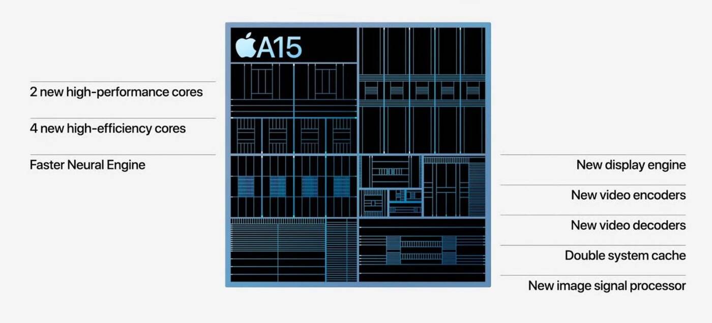 Apple A15 Bionic, jako bezpośredni następca A14 Bionic, jest produkowany z wykorzystaniem 5 nm technologii TSMC, dzięki której producent upchnął w nim aż 15 miliardów tranzystorów. Konfiguracja tego SoC obejmuje 6-rdzeniowy procesor centralny, z czego dwa rdzenie są tymi wysokowydajnymi, a pozostałe cztery energooszczędnymi.