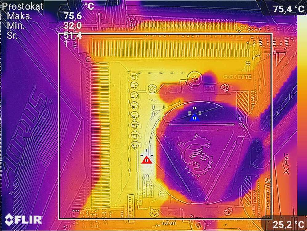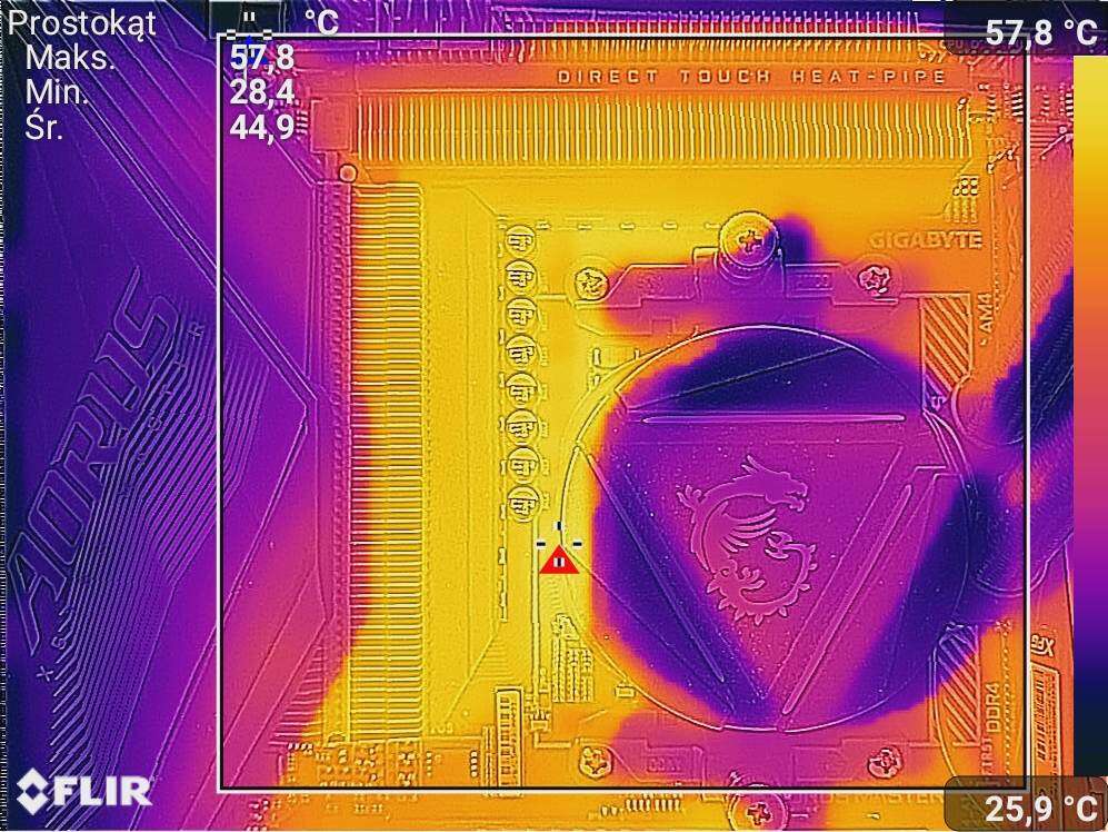 Czujnik na płycie pokazywał kolejno 57°C i 70°C. Temperatury bez OC są więc bardzo niskie, a po OC nadal pozostają na bardzo dobrym poziomie. Nie ma więc mowy o przegrzewaniu się sekcji nawet po OC 5950X, które swoją drogą jest bardzo proste do wykonania.