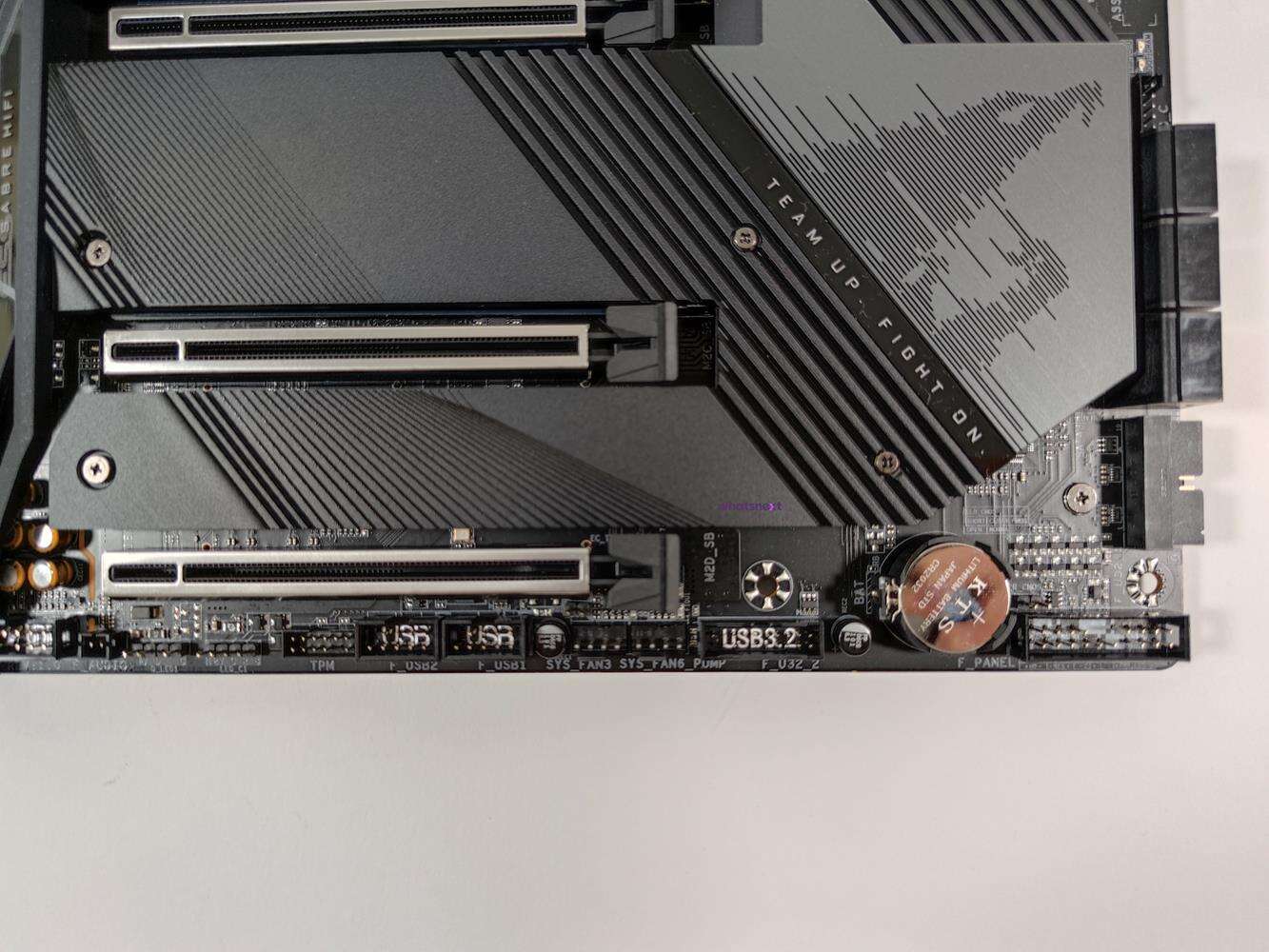 Na tylnym panelu na samej górze mamy do dyspozycji dwa przyciski – Q-Flash Plus oraz Clear CMOS. Poniżej są złącza, których ilość ponownie jest spora. Tutaj do dyspozycji mamy 2x wyjścia na anteny WiFi, 1x USB-C Gen2x2, 5x USB 3.2 Gen2, 2x USB 3.2 Gen1, 4x USB 2.0, 1x RJ-45, 1x Optical S/PDIF oraz 5x audio. Sama liczba USB jest naprawdę spora, a plusem jest złącze Gen2x2. Szkoda jednak, że nie ma jeszcze jednego złącza ethernet, co mogło by być czasami przydatne. Szkoda też, że mimo wszystko nie ma tutaj złączy Thunderbolt. Producent nie umieścił też żadnych wyjść obrazu, więc na tej płycie nie zbudujecie PC opartego o zintegrowaną kartę graficzną.