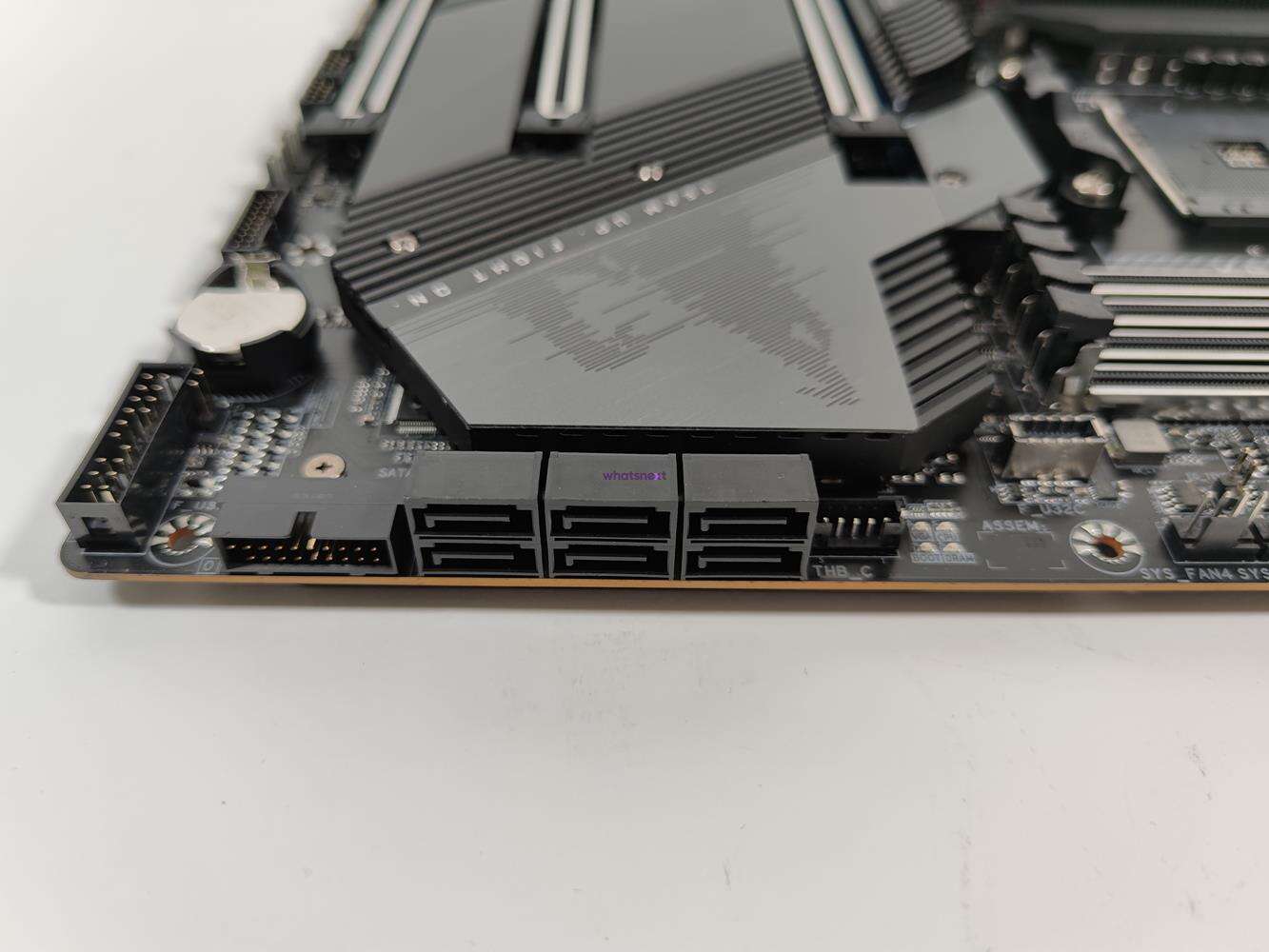 Testowana konstrukcja ma cztery złącza na dyski M.2. Każde z nich obsługuje konstrukcje 2242/2280/22110. Za górne odpowiada procesor i działa ono w trybie Gen4 x4 przy CPU serii 3000 lub 5000. Pozostałe podciągnięte są pod chipset. Tutaj działają one w trybie Gen4 x4 przy ponownie powyższych procesorach. Dodatkowo górne złącze oraz dwa dolne wspierają także dyski SATA. Pełną konfigurację w zależności od zastosowanych dysków znajdziecie w instrukcji. Warto tutaj też zauważyć, że każde ze złączy ma radiator, a górny jest większy od reszty (Thermal Guard III). Tutaj możemy spodziewać się dobrych wyników temperatur włożonego tam dysku. Płyta ma także sześć złączy SATA 6 Gb/s.