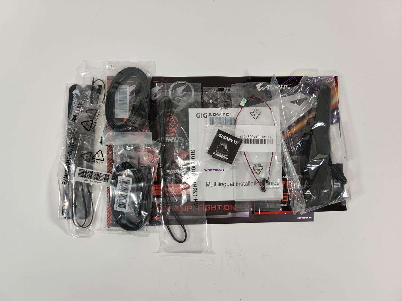 Ponieważ płyta to konstrukcja z wyższej półki, to wraz z nią otrzymujemy mnóstwo dodatków. W pudełko znajduje się zestaw naklejek i śrubek, instrukcja, opaski na rzepy, G-Connector, antena WiFi, cztery kable SATA, dwa czujniki temperatur, czujnik głośności i przedłużacz RGB. Antena WiFi jest na kablu, więc możecie postawić ją w dowolnym miejscu. Plusem na pewno jest reszta dodatków, które pozwolą na łatwe zbudowanie zestawu komputerowego.
