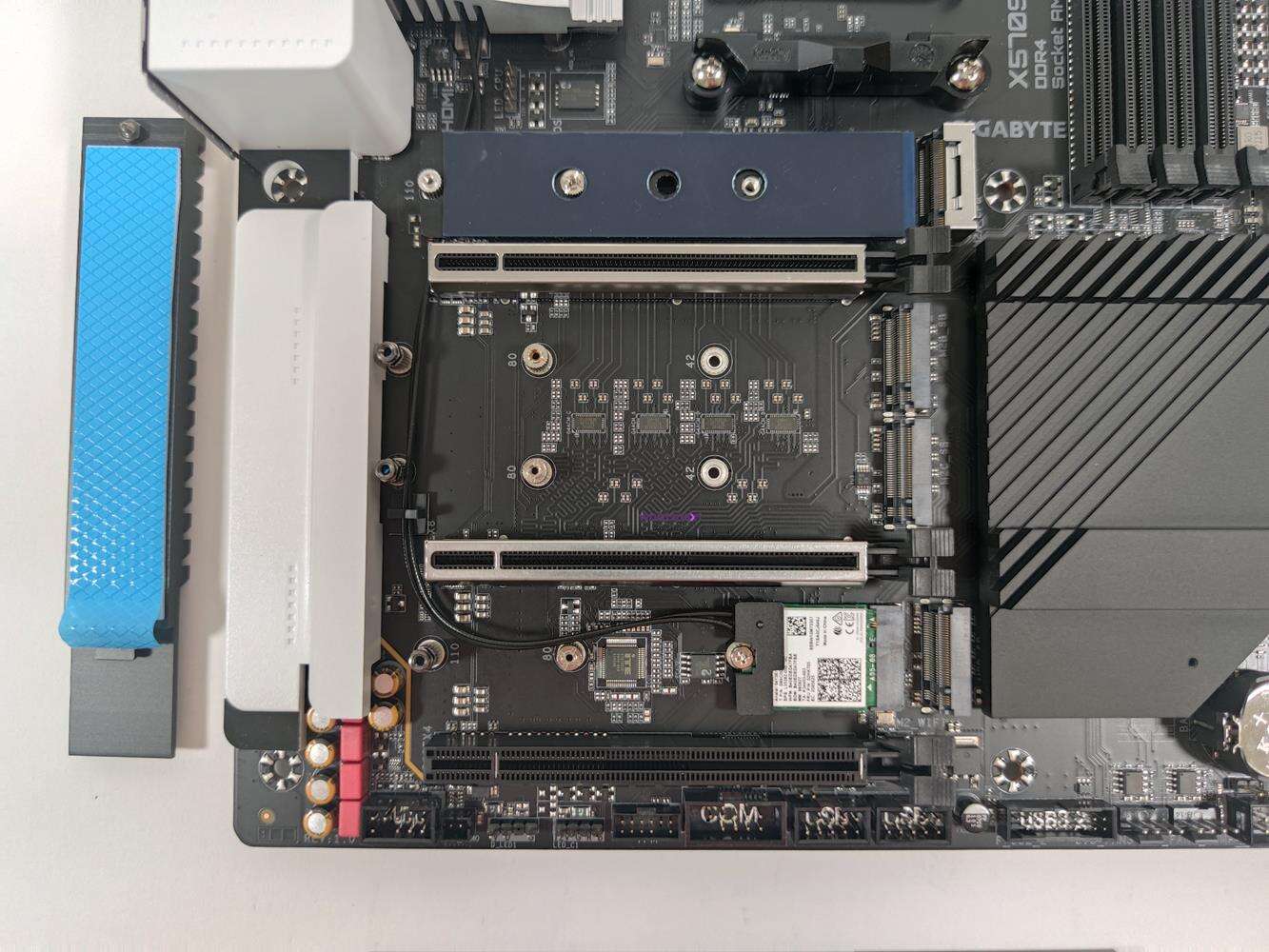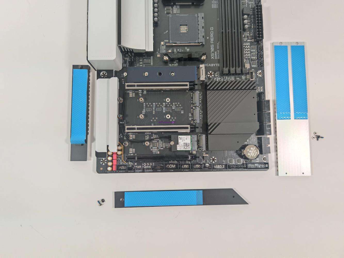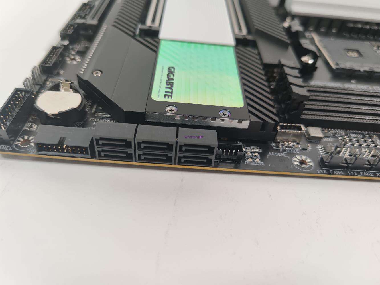 Ogromnym plusem jest obecność czterech złączy M.2. Wszystkie mają radiatory, a ten górny jest większy od reszty, co powinno zapewnić jeszcze lepsze chłodzenie schowanego tam dysku. Jak zawsze złącza działają w zależności od zastosowanego procesora, a w przypadku najnowszych będzie to (idąc od góry): SATA i PCI-E 4.0 x4 (CPU), PCI-E 4.0 x4 (chipset) oraz 2x SATA i PCI-E 4.0 (chipset). Obsługiwane rozmiary M.2 to 2242/2280/22110 – jedynie złącze M2D_SB nie obsługuje 2242 (jest pod nim zamontowana karta WiFi). Nie zabrakło też sześciu złączy SATA 6 Gb/s. Dokładne działanie złączy w zależności od zastosowanego sprzętu jest w instrukcji.