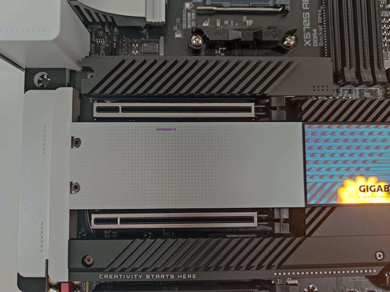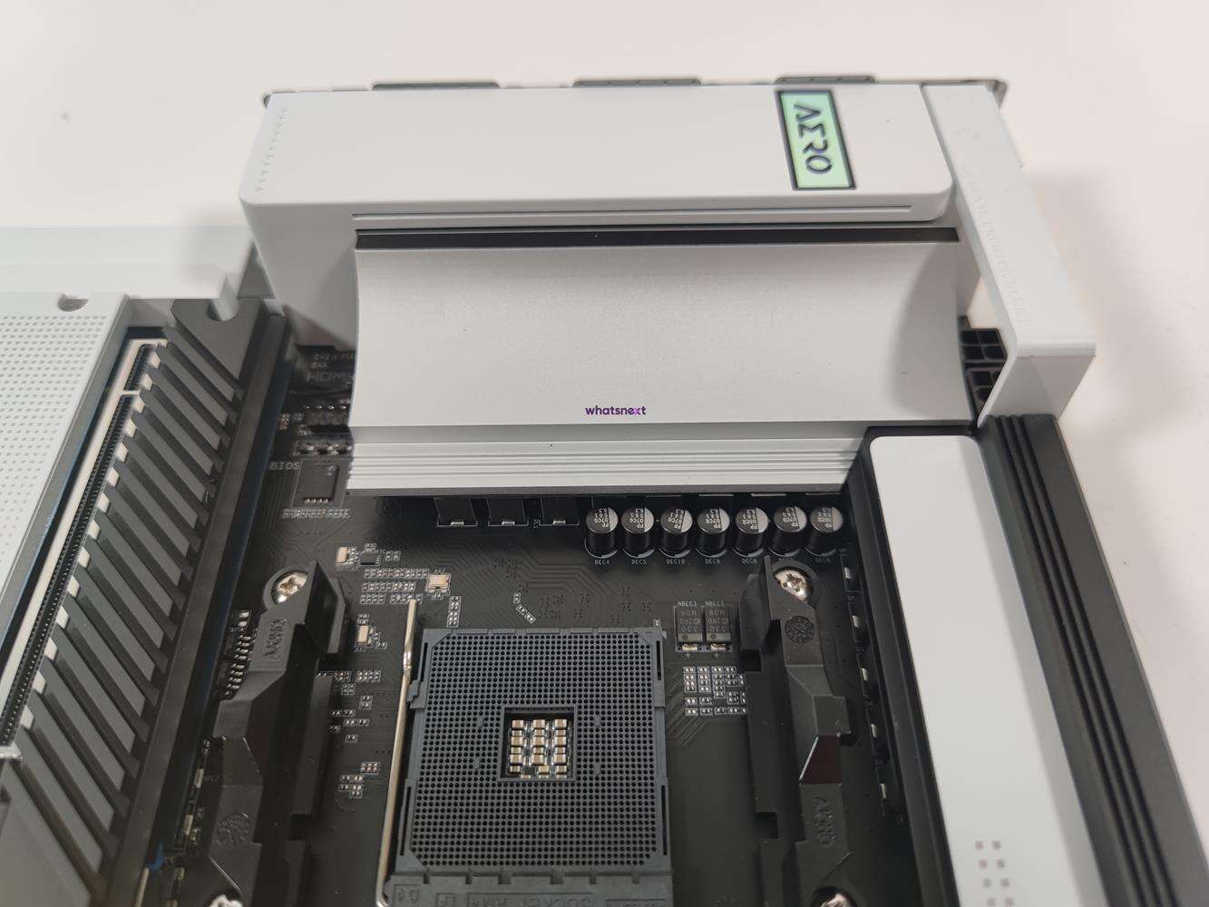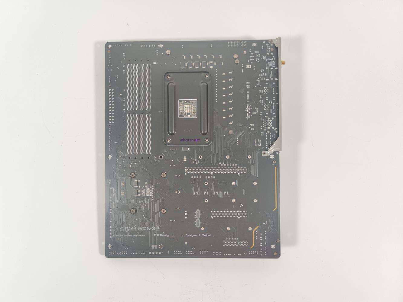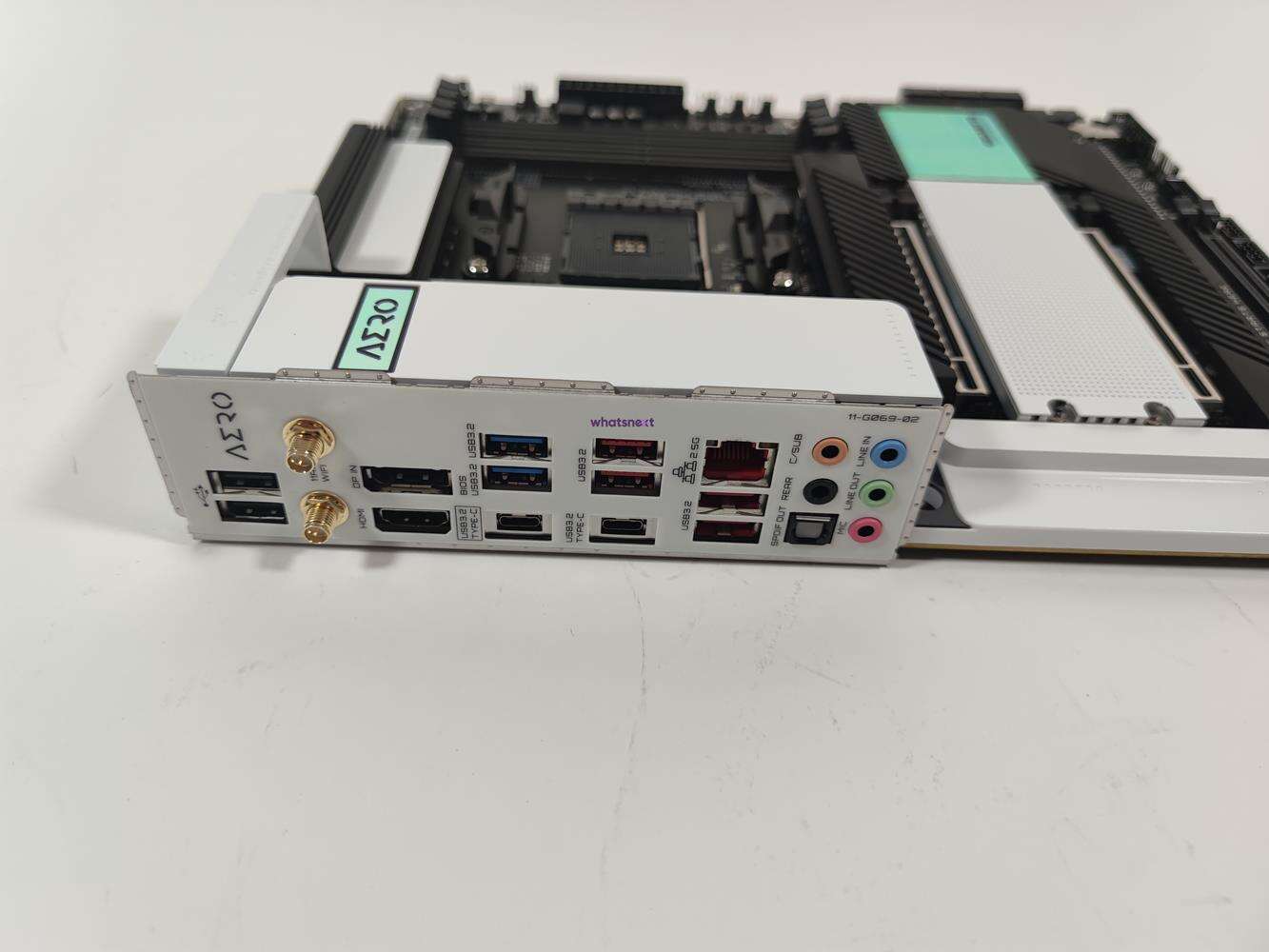 Na tylnym panelu mamy dwa złącza USB 2.0, dwa wejścia na anteny, 1x DisplayPort, 1x HDMI, 1x USB-C Gen2x2, 1x USB-C 3.2 Gen1, 4x USB 3.2 Gen2, 2x USB 3.2 Gen1, 1x optical S/PDIF oraz 5 x audio. Jak sami widzicie nie ma tutaj żadnych przycisków, co na pewno jest pewną wadą. brakuje mi też samego Thunderbolta – skoro to płyta dla profesjonalistów, producent powinien o tym pomyśleć. Kolejna rzecz to tylko jedno złącze ethernet – dwa były by miłym dodatkiem. Plusem jest za to technologia VisionLink obsługiwana przez port USB-C 2×2.