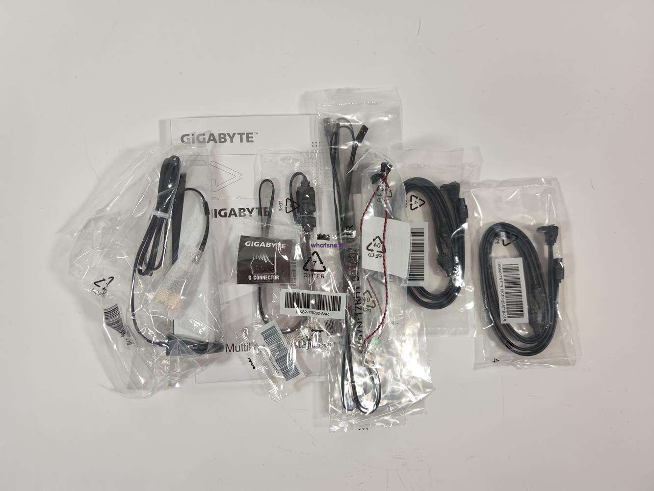Dołączone akcesoria obejmują instrukcję, płytę ze sterownikami, zestaw śrubek, cztery kable SATA, G-Connector, antenę WiFi, przedłużacz RGB, dwa czujniki temperatur i czujnik głośności. Dodatki tak naprawdę wyczerpują więc temat – jest wszystko, czego można by oczekiwać od płyty głównej. Sama antena WiFi jest na kablu, więc możecie ją postawić w dowolnym miejscu np. na biurku.
