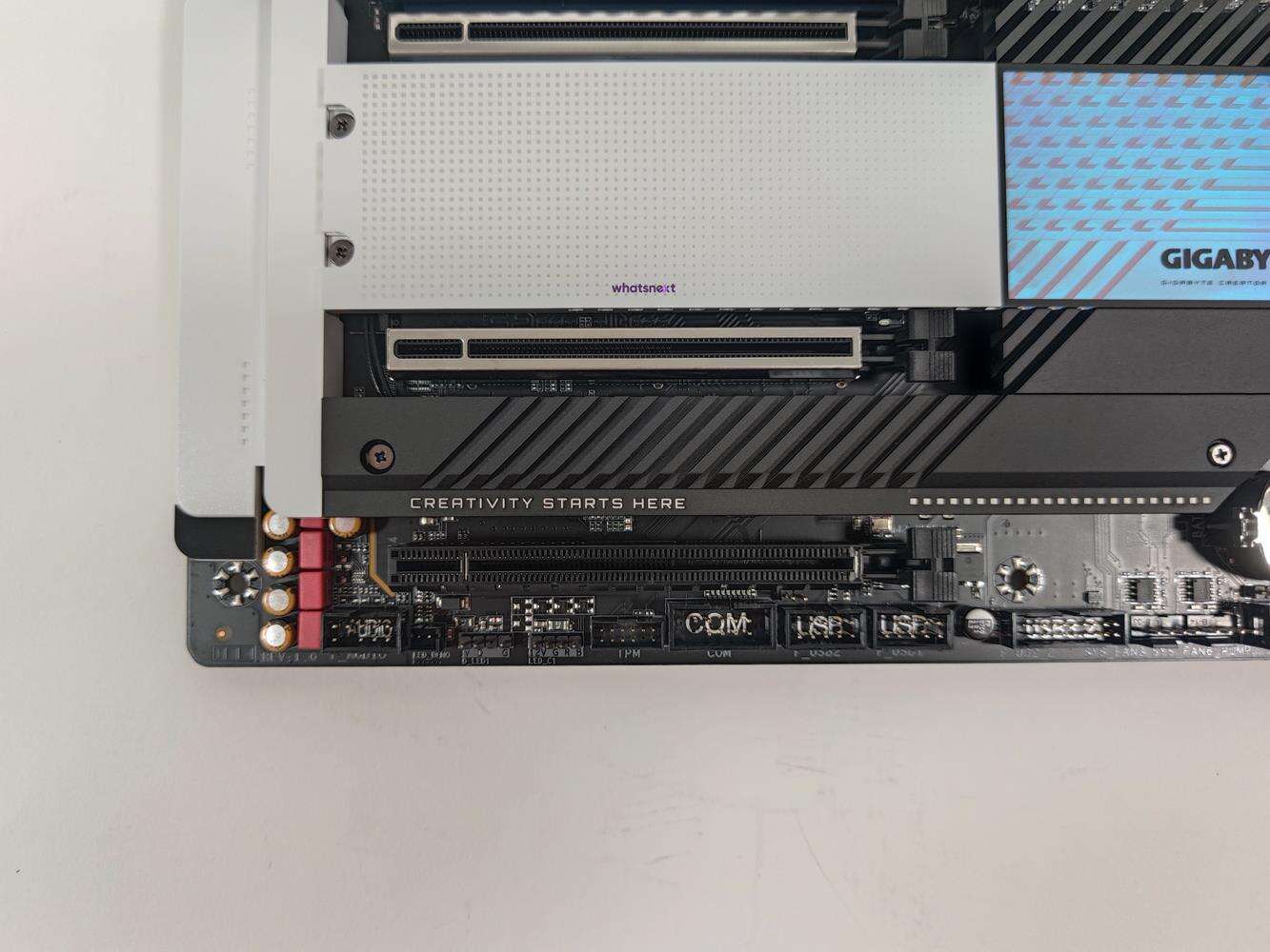 Na samym PCB znajdziemy następujące złącza: 1x CPU fan, 1x water cooling CPU fan, 4x system fan, 2x system fan/ water cooling pump, 2x ARGB, 2x RGB, 1x CPU cooler LED/ RGB LED, 1x złącza do przedniego panelu, 1x audio, 1x USB-C, 2x USB 3.2 Gen1, 2x USB 2.0, 1x wejście na czujnik głośności, 2x wejście na czujnik temperatury, 1x TPM, 1x Thunderbolt add-in card, 1x serial port. Jest też obecna zworka do czyszczenia CMOS oraz przycisk Q-Flash Plus. Szkoda, że nie ma przycisków ani wyświetlacza kodów POST, ale poza tym ciężko jest się czegoś przyczepić. Rozłożenie złączy jest również dobre i spokojnie dotrzecie przewodami do danych miejsc.
