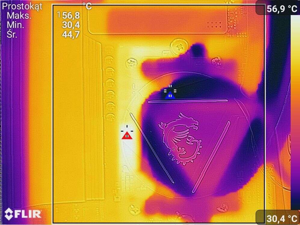 Temperatury wskazywane przez czujniki na płycie to kolejno 57°C i 72°C. Płyta nie ma więc problemów z odprowadzaniem ciepła z sekcji nawet po podkręceniu procesora. Spokojnie więc możecie ją parować z 5950X i wykonywać OC CPU.