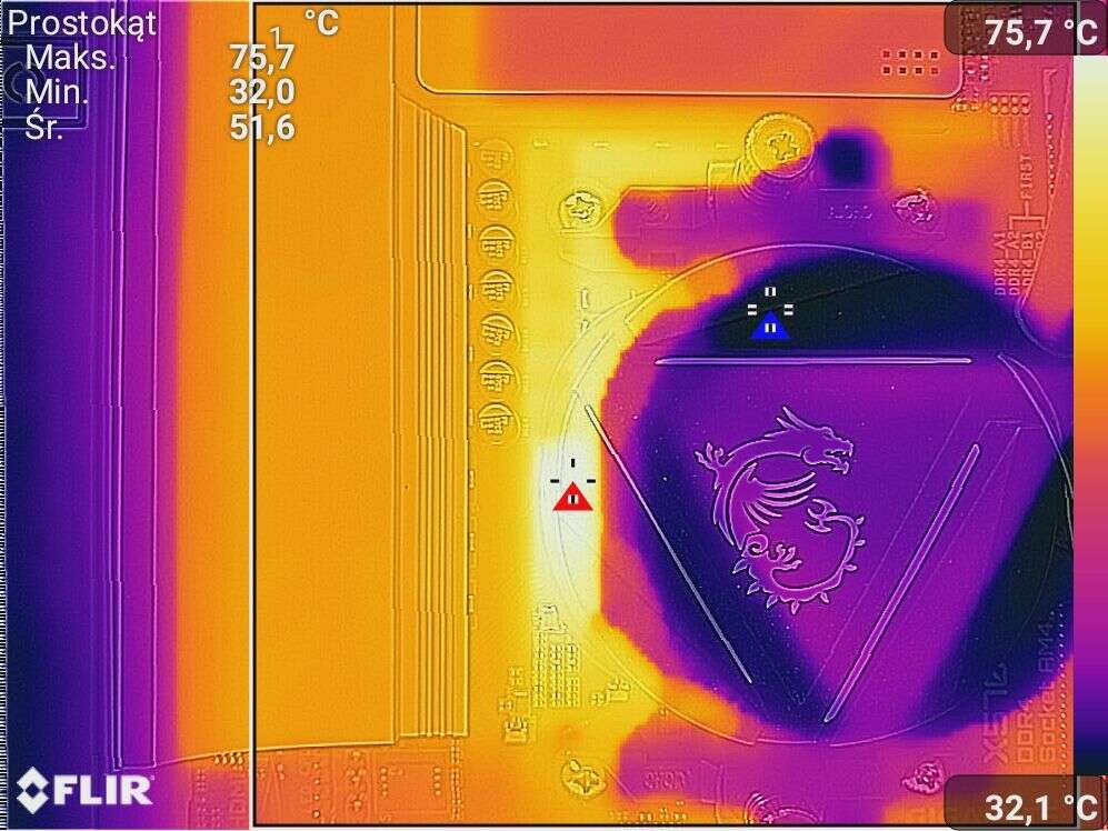 W testach temperatury wykorzystałem moduł termowizyjny smartfonu CAT S61. Obciążenia dokonałem za pomocą programu Cinebench R23, który trwał 15 minut. Pomiary przeprowadziłem też po OC procesora do 4,4 GHz.
