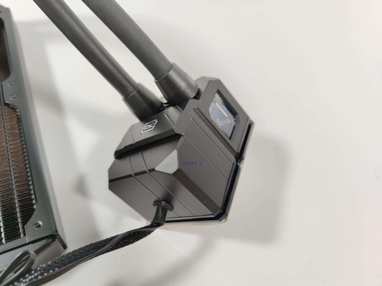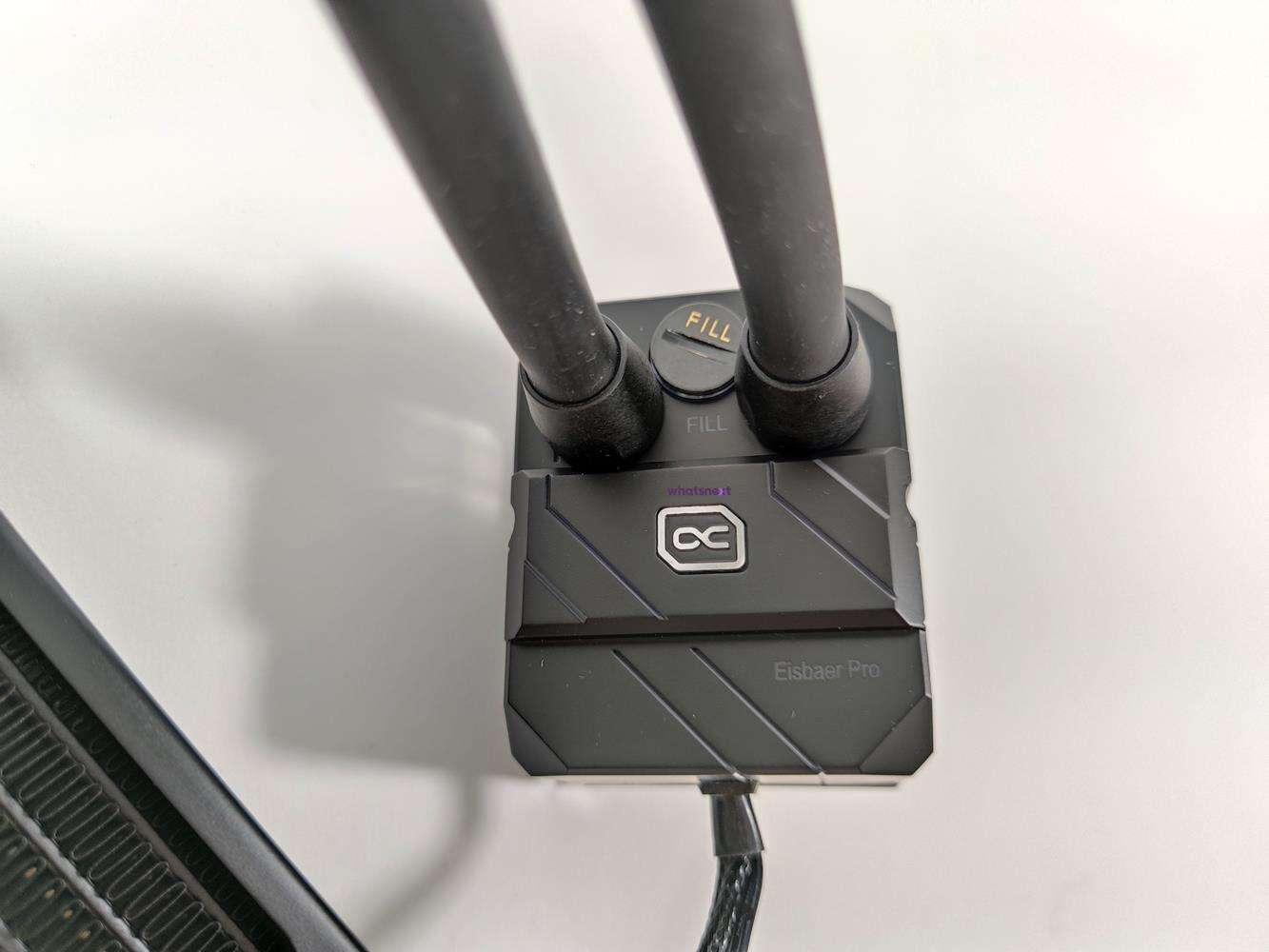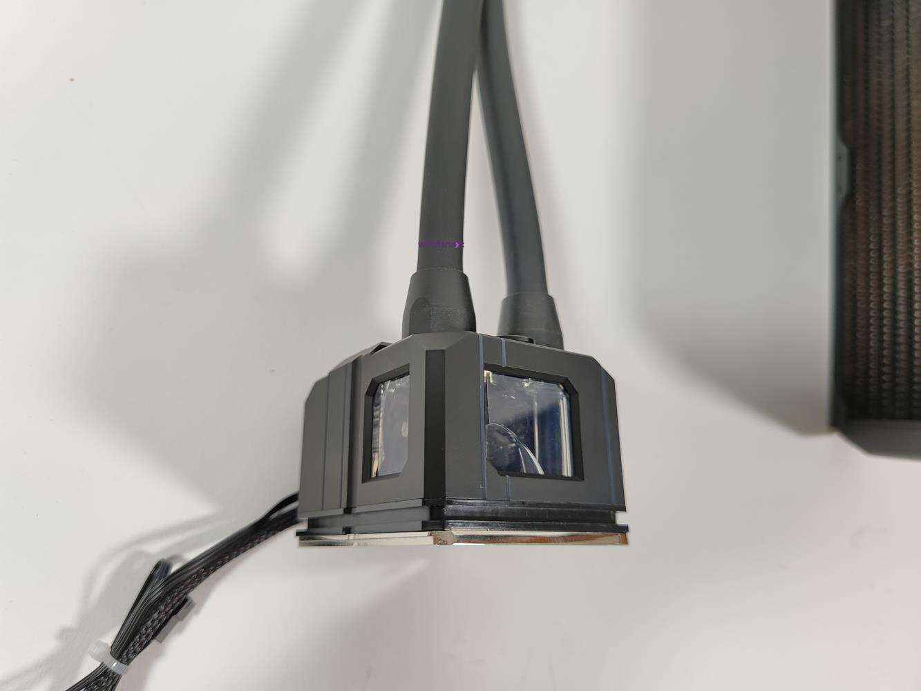 Sama blokopompka ma wymiary 64 x 79 x 54,3 mm. Podstawka wykonana jest z niklowanej miedzi i jest ona bardzo duża. Bez problemów więc obejmie np. Threadrippera, ale ma to swoje konsekwencje – AiO nie nadaje się na mniejsze procesory Intela, czyli nie ma dołączonego montażu pod LGA1200. Jest za to pod AM4, co wykorzystałem w testach. Pompka to model DC-LT2 o maksymalnej prędkości 2600 RPM. MTBF jest równe 50000h, a przepływ 75 l/h. Całość musi też zostać zamontowana w jednej słusznej orientacji. Z blokompompki wychodzą dwa kable – 3 pin oraz 3 pin ARGB. Warto też zwrócić uwagę na otwór, przez który możecie uzupełnić poziom cieczy w układzie.