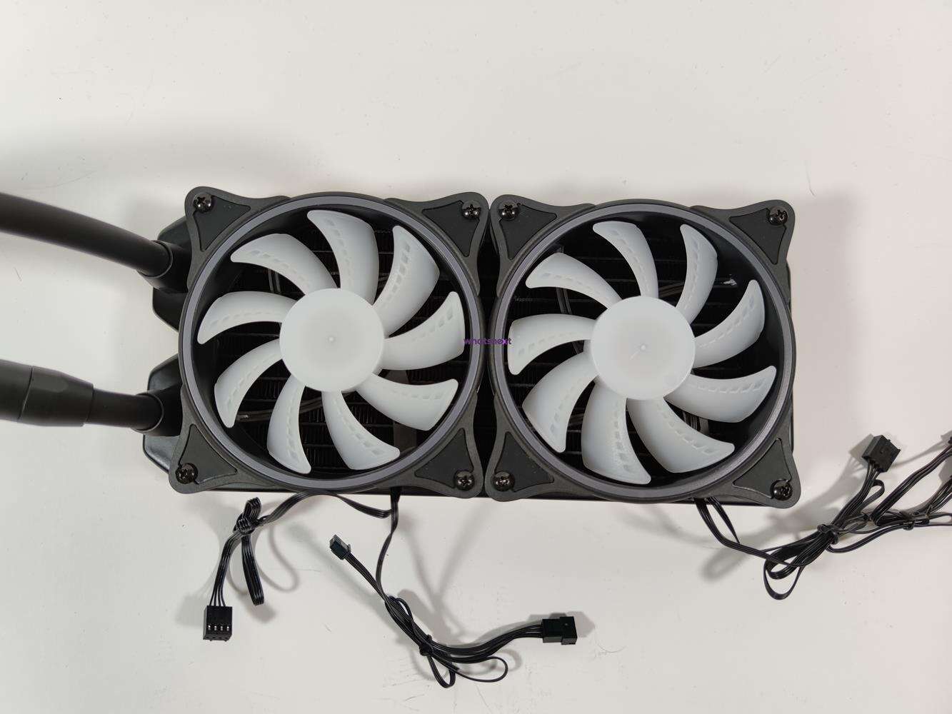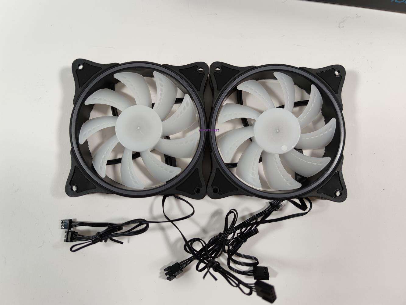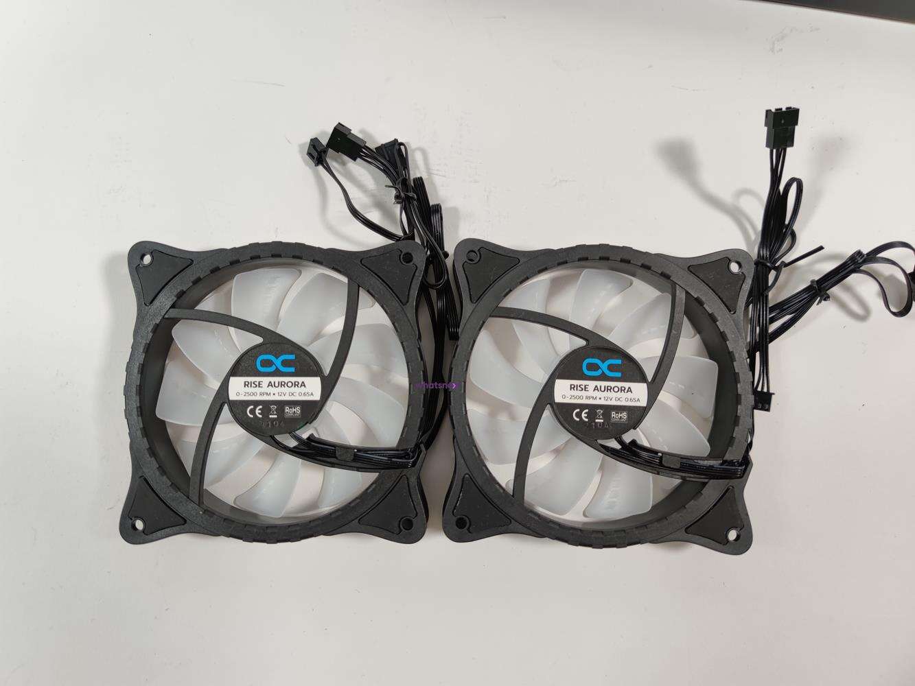 W zestawie znajdują się dwa wentylatory Rise Aurora 120 mm o maksymalnej prędkości 2500 RPM. Może być więc naprawdę głośno. Na maksymalnych obrotach przepływ powietrza wynosi 118,9 m^3/h, a ciśnienie 3,17 mmH2O. Producent podaje też maksymalną głośność wentylatora jako 31,5 dBA. Ze śmigieł wychodzą po dwa złącza – 4 pin PWM oraz 3 pin ARGB. Co ciekawe złącza ARGB nie pasują do płyt głównych, ale w zestawie jest odpowiednia przejściówka.