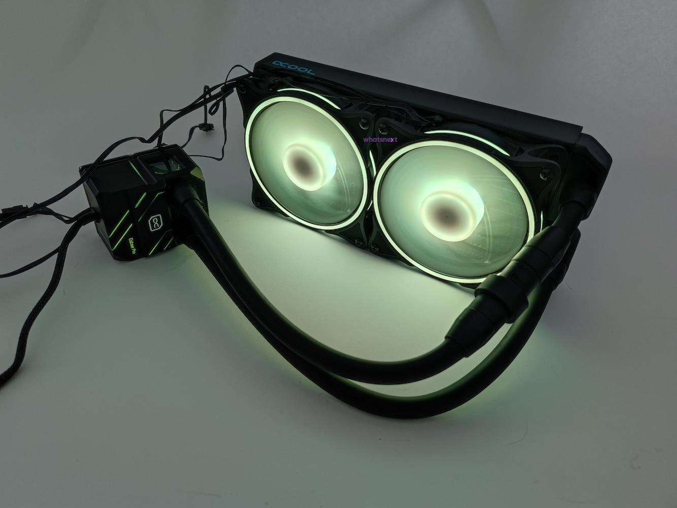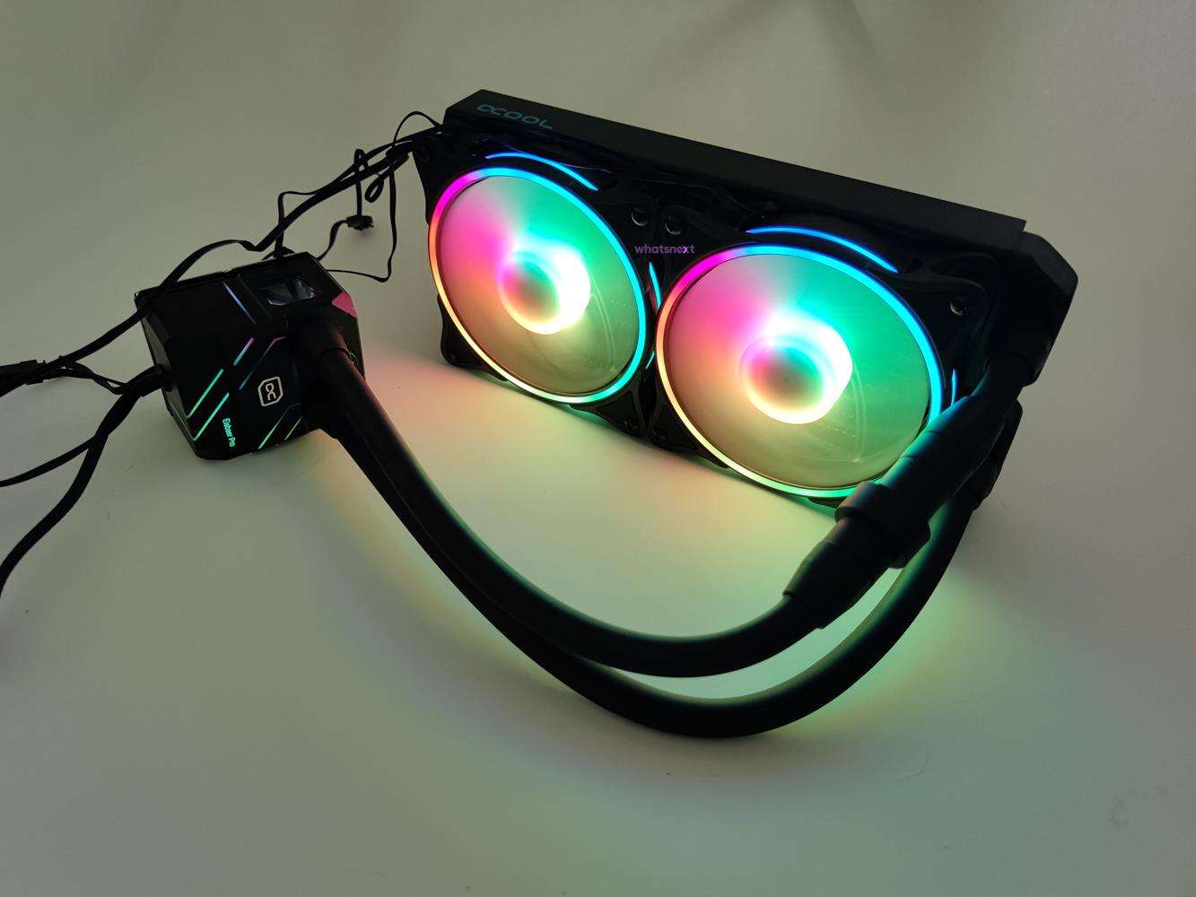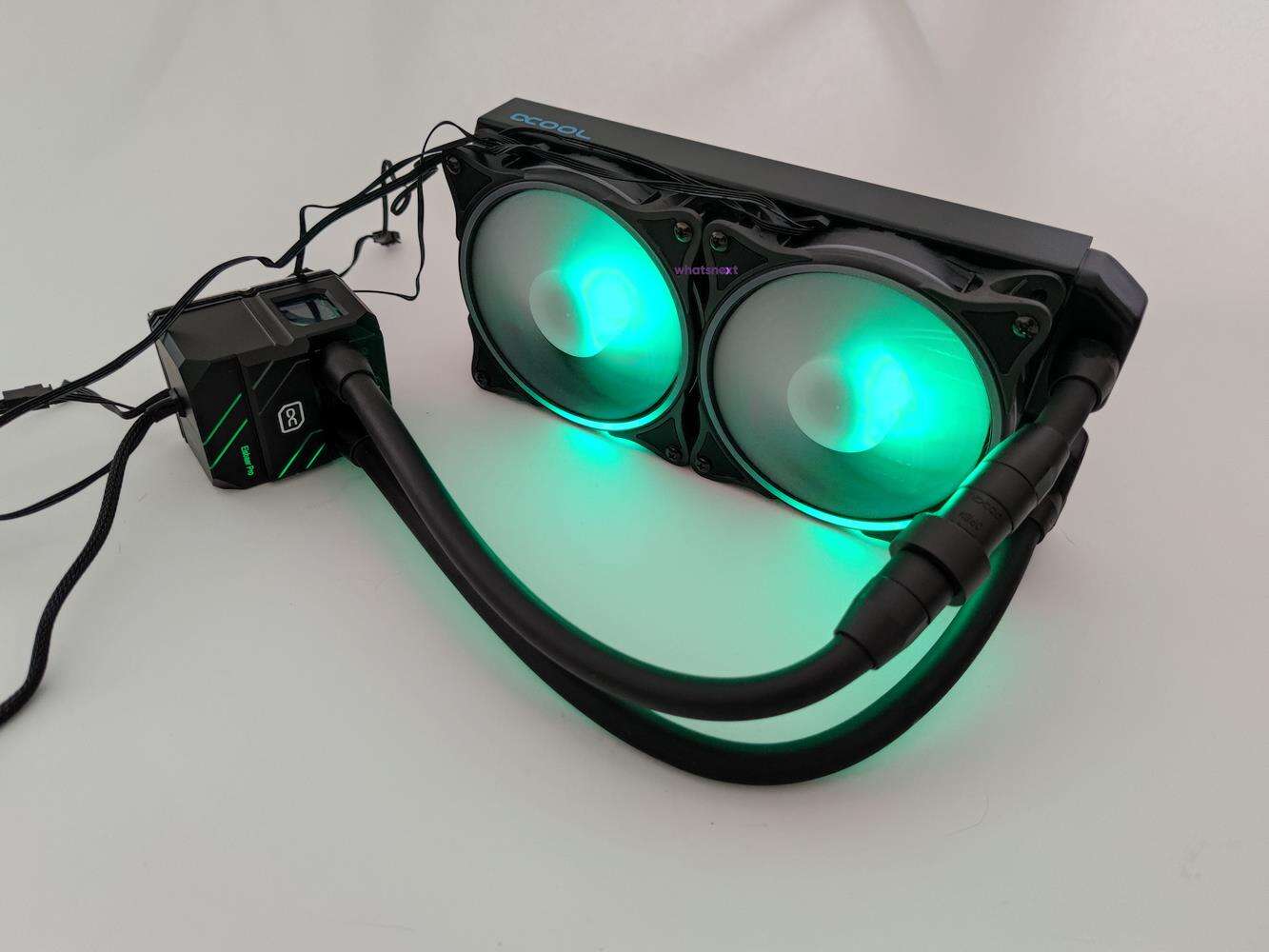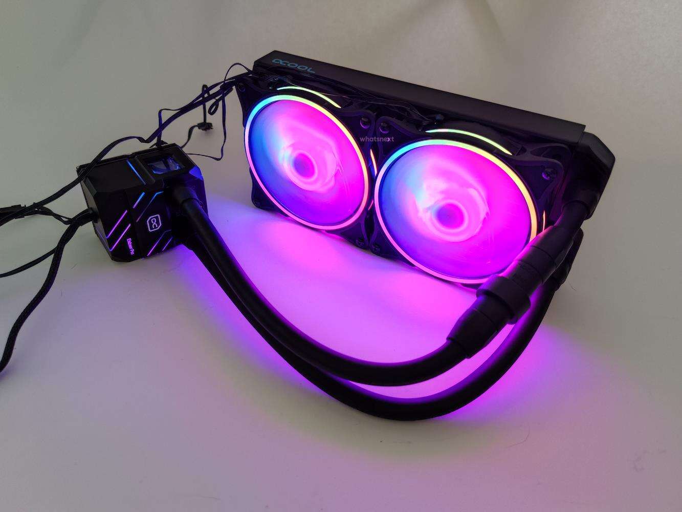 AiO wygląda znakomicie. Podświetlane wentylatory wraz z blokopompką zdecydowanie mogą się podobać. Po bokach blokopompki są też okna, przez które widać ciecz, co również znakomicie wygląda. Moim zdaniem taka konstrukcja bardzo fajnie zaprezentuje się w obudowie z oknem. Jakość wykonania całości jest znakomita, jak zwykle u Alphacoola.