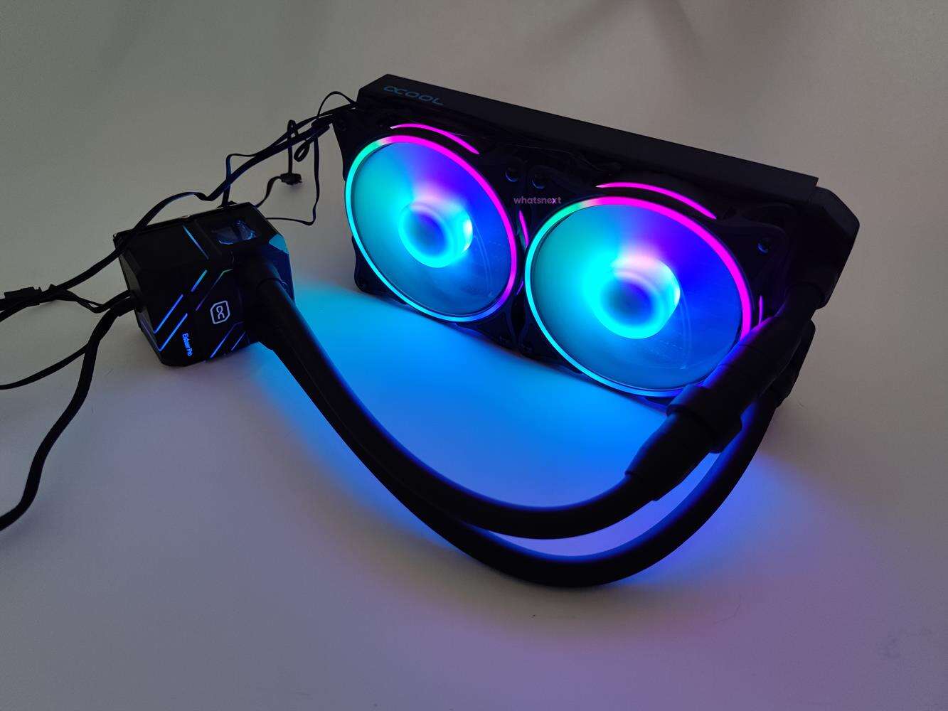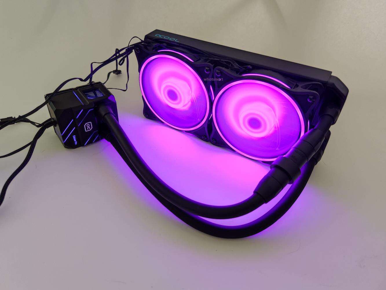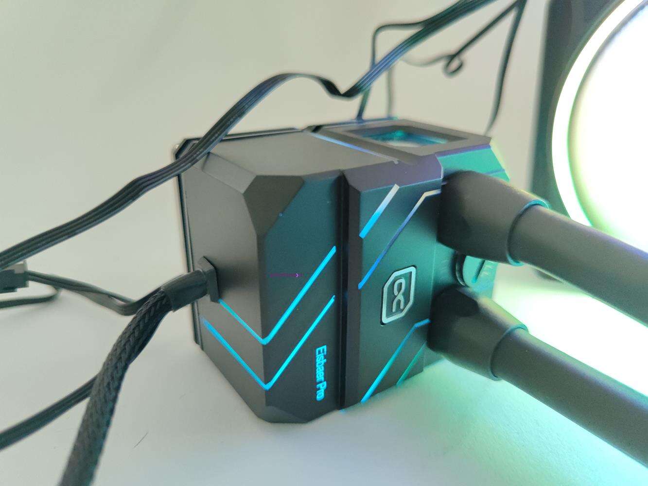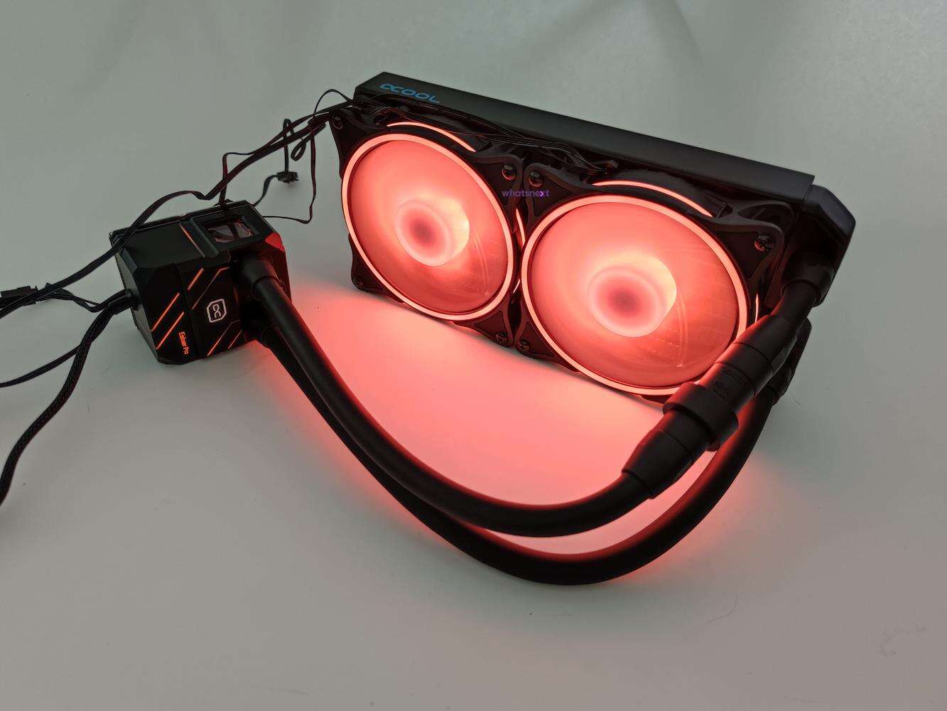 AiO wygląda znakomicie. Podświetlane wentylatory wraz z blokopompką zdecydowanie mogą się podobać. Po bokach blokopompki są też okna, przez które widać ciecz, co również znakomicie wygląda. Moim zdaniem taka konstrukcja bardzo fajnie zaprezentuje się w obudowie z oknem. Jakość wykonania całości jest znakomita, jak zwykle u Alphacoola.