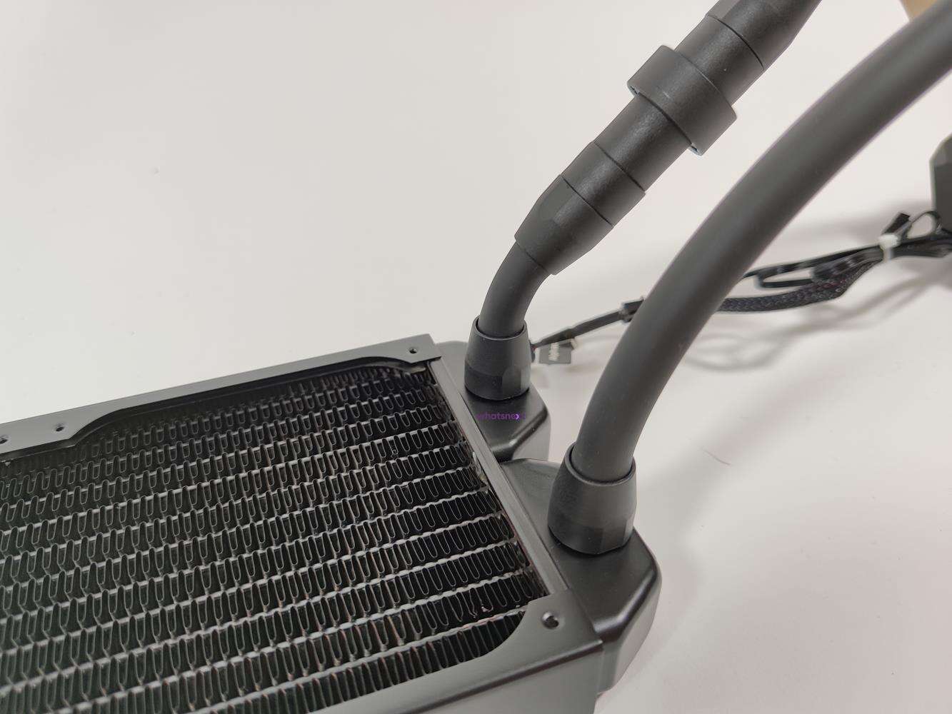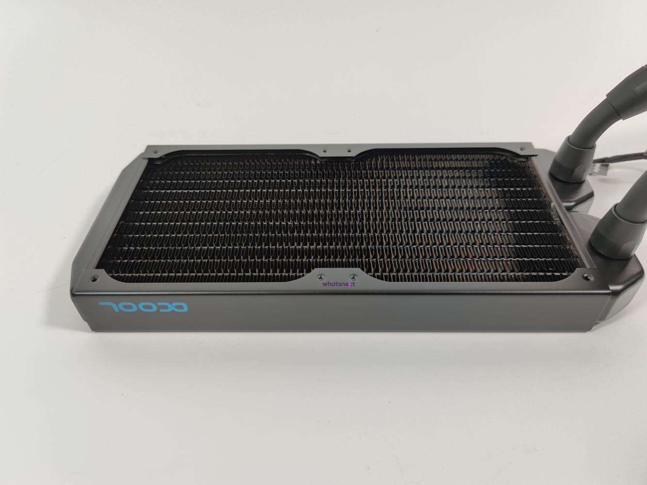 Chłodnica ma wymiary 279 x 124 x 30 mm i została wykonana z miedzi. Ma dwa gwinty G1/4″ i miejsca na łącznie 4 wentylatory 120 mm. Wychodzą z niej dwa węże o długości 400 mm. Alphacool kontynuuje swoją tradycję i jeden z nich ma szybkozłączkę, która pozwala na łatwe rozszerzenie zestawu o kolejny blok czy chłodnicę. Węże łączą się z blokopompką od góry, ale są naprawdę elastyczne, więc tutaj żadnych problemów z ich ułożeniem nie przewiduję.