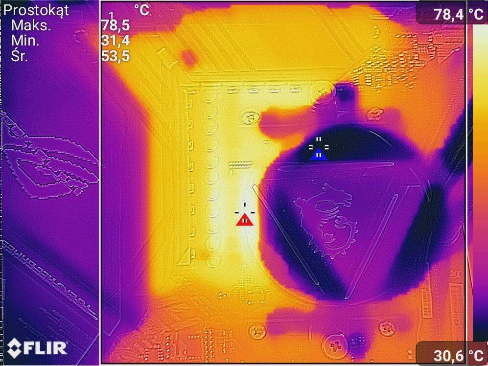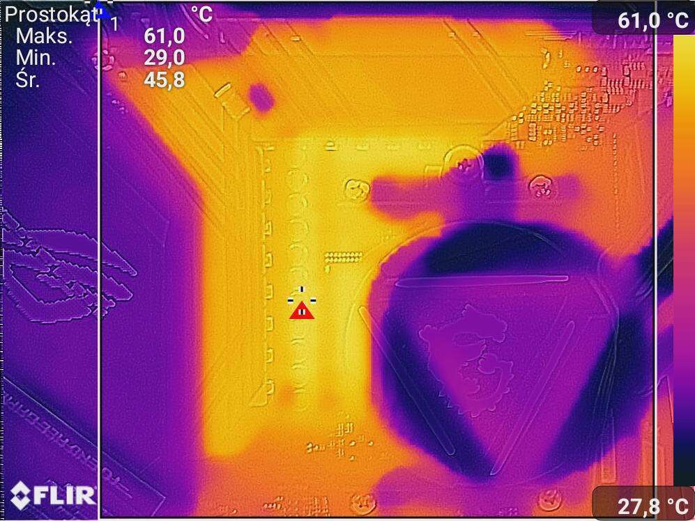 W testach temperatury wykorzystałem moduł termowizyjny smartfonu CAT S61. Obciążenia dokonałem za pomocą programu Cinebench R23, który trwał 15 minut. Pomiary przeprowadziłem też po OC procesora do 4,4 GHz.