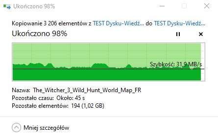 Testy przed i po zapełnieniu potwierdziły, że HDD nie dręczy spadek wydajności po zapełnieniu i nic w tym dziwnego, bo sposób, w który zapisują dane, znacząco różni się od sposobu dysków SSD, które po zapełnieniu często znacząco tracą na wydajności. Jak z kolei Toshiba Canvio Gaming 2 TB spisze się w praktycznych testach i w porównaniu z innymi dyskami? Wyniki podejrzycie poniżej, ale zanim się z nimi zapoznacie, rzućcie powyżej okiem na sposób, w jaki dysk radził sobie z plikami Wiedźmina i pojedynczym plikiem o dużym rozmiarze: