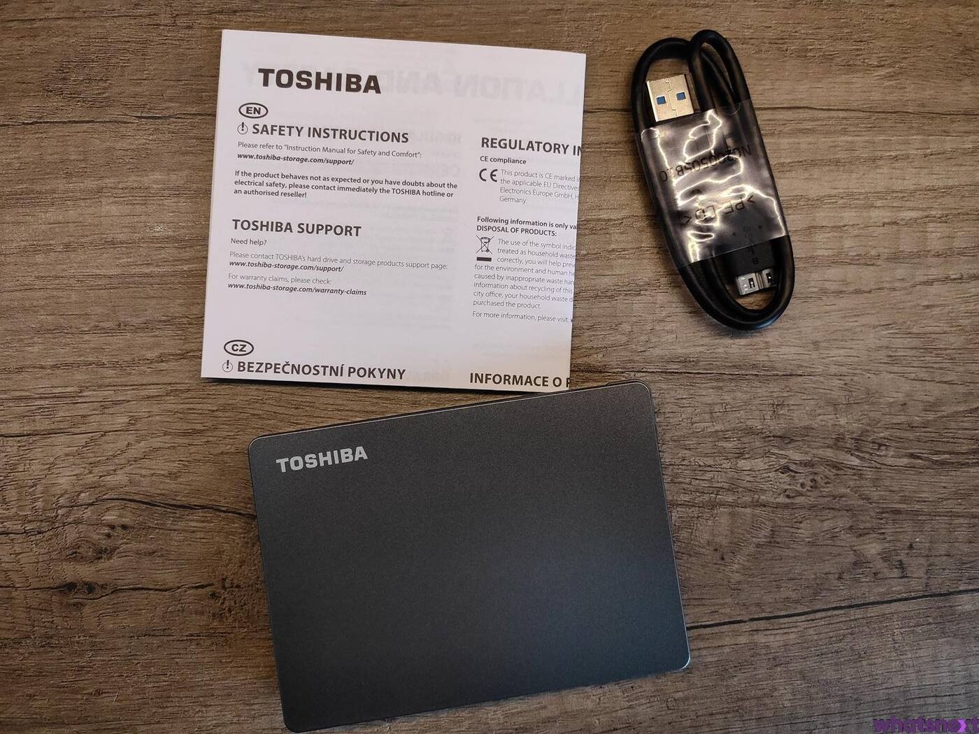 Zewnętrzne dyski HDD, to w obecnych czasach wydajnościowe potworki w tym złym słowa znaczeniu. Chociaż są tańsze od SSD, to trudno nie narzekać na ich bardzo niską wydajność. Jest to jednak jeden z najtańszych sposobów na poszerzenie swojego magazynu danych i to z myślą nie tylko o jednym sprzęcie. W praktyce ten model zapewni Wam 1,81 TB wolnego miejsca, a po podłączeniu go znajdziecie na nim preinstalowaną instrukcję obsługi: