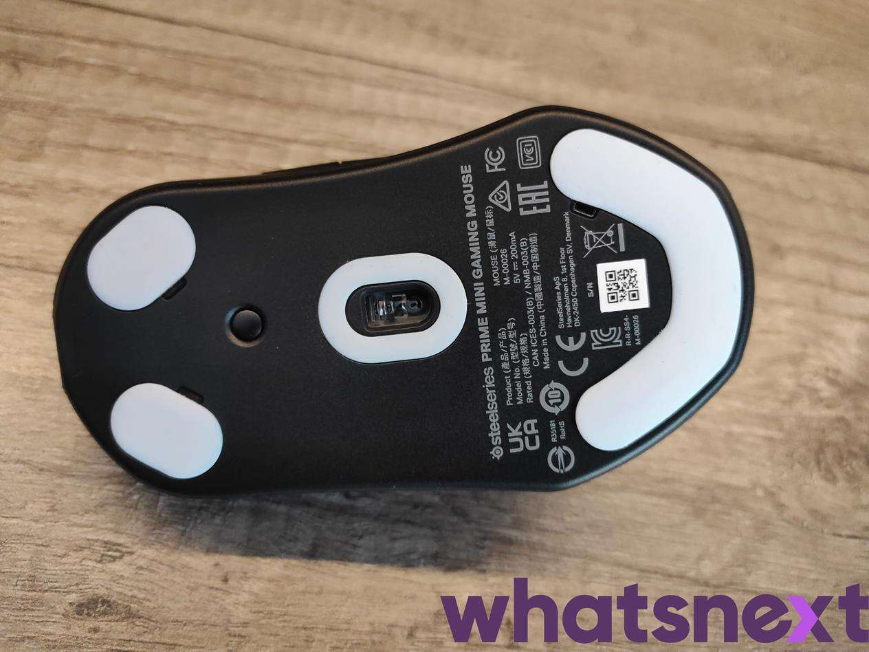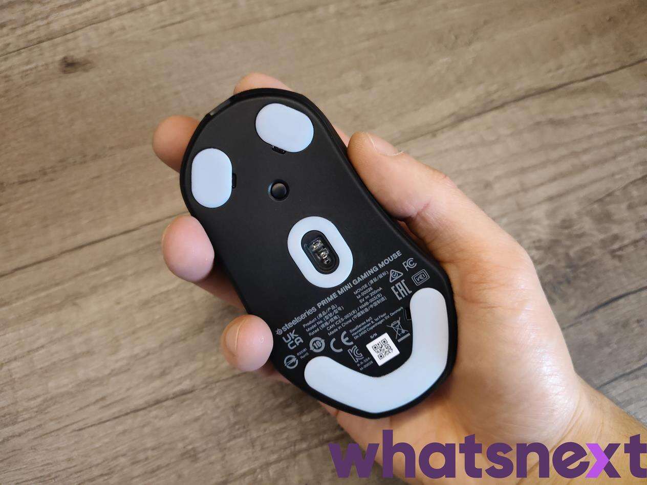 Na spodzie myszki Prime Mini zaskoczenie może być mały prosty przycisk, który znalazł się obok czterech wysokiej jakości ślizgaczy o zaokrąglonych krawędziach i oczywiście wnęce sensora. Dzięki niemu możemy zmieniać zarówno czułość na pięciu predefiniowanych ustawieniach, jak i odświeżanie USB (125, 250, 500, 1000 Hz).