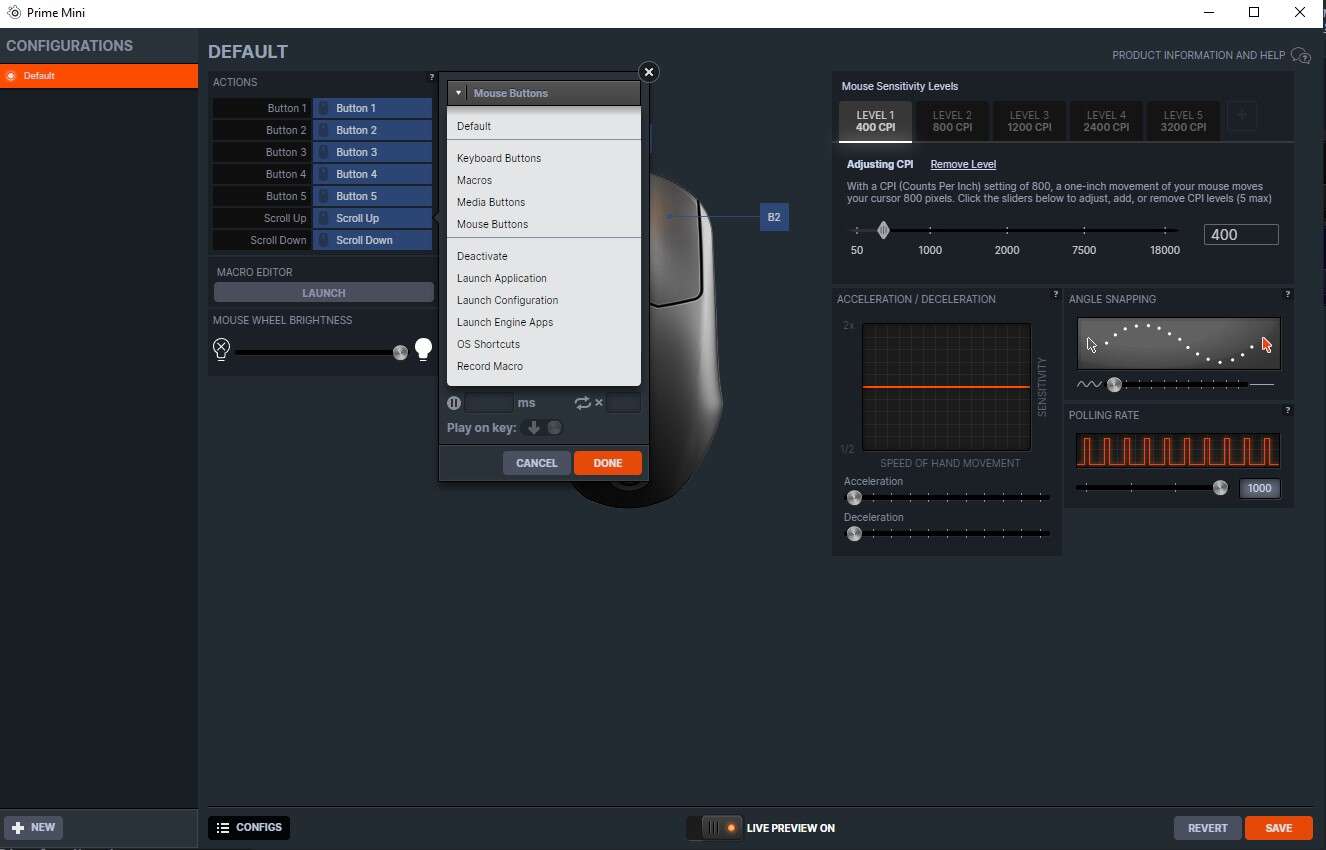 Producent reklamuje model Prime Mini, jako myszkę dla profesjonalnych graczy, grających nie tylko u siebie, co akcentuje obecność odpinanego przewodu, wbudowanej pamięci i możliwość ustawiania DPI oraz częstotliwości odświeżania za pomocą wspomnianego przyciski na spodzie. Odpowiada za to wbudowana pamięć, ale nic nie stoi na przeszkodzie, aby wykorzystać do personalizacji rozbudowaną aplikację Steelseries GG.