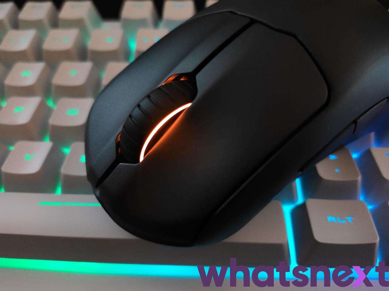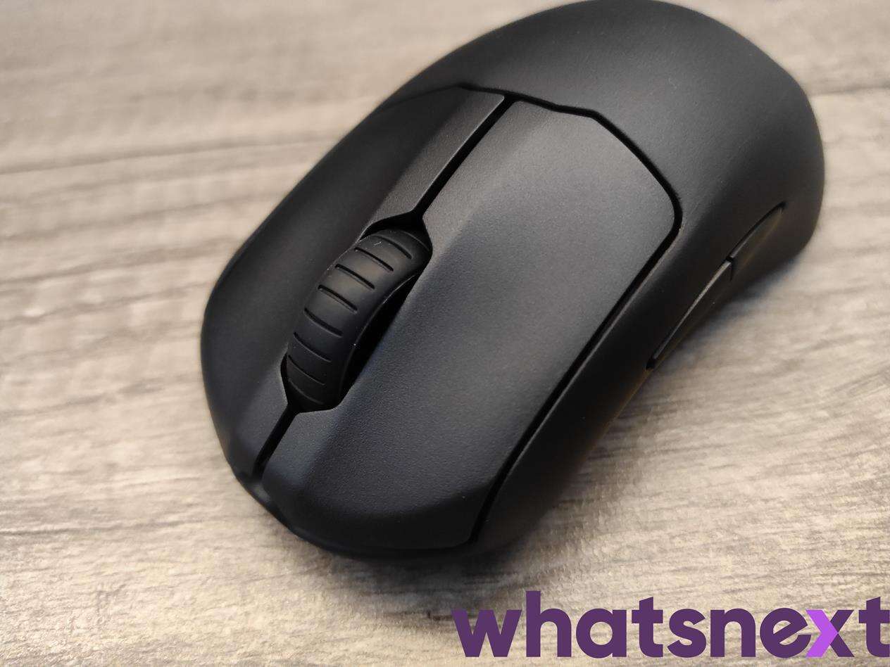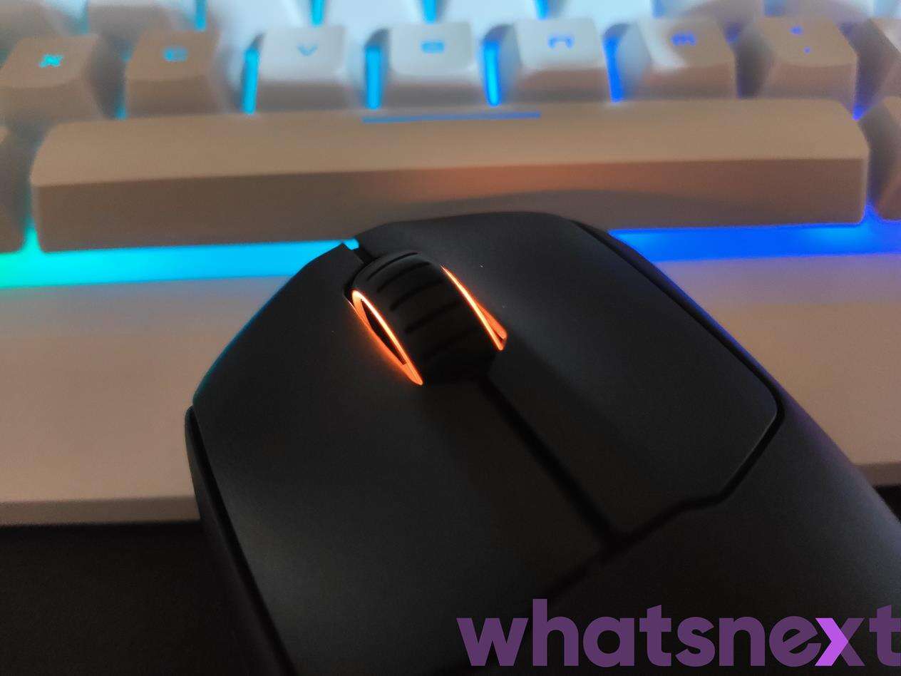 Tego typu rozwiązanie w praktyce wypada świetnie, gwarantując na dodatek wysoką responsywność, a na dodatek twardy i głośny, choć niewymagający przesadnie dużej ilości siły, klik. Co ciekawe, różni się on od kliku w modelach Prime przez mniejsze skrzydełka, które nadały tym przełącznikom okazalszej surowości. Jak dla mnie jest to zaletą. Równie dobrze sprawdzają się też boczne przyciski oraz rolka na łożysku, zapewniającym wyczuwalne przeskoki między następnymi stopniami.