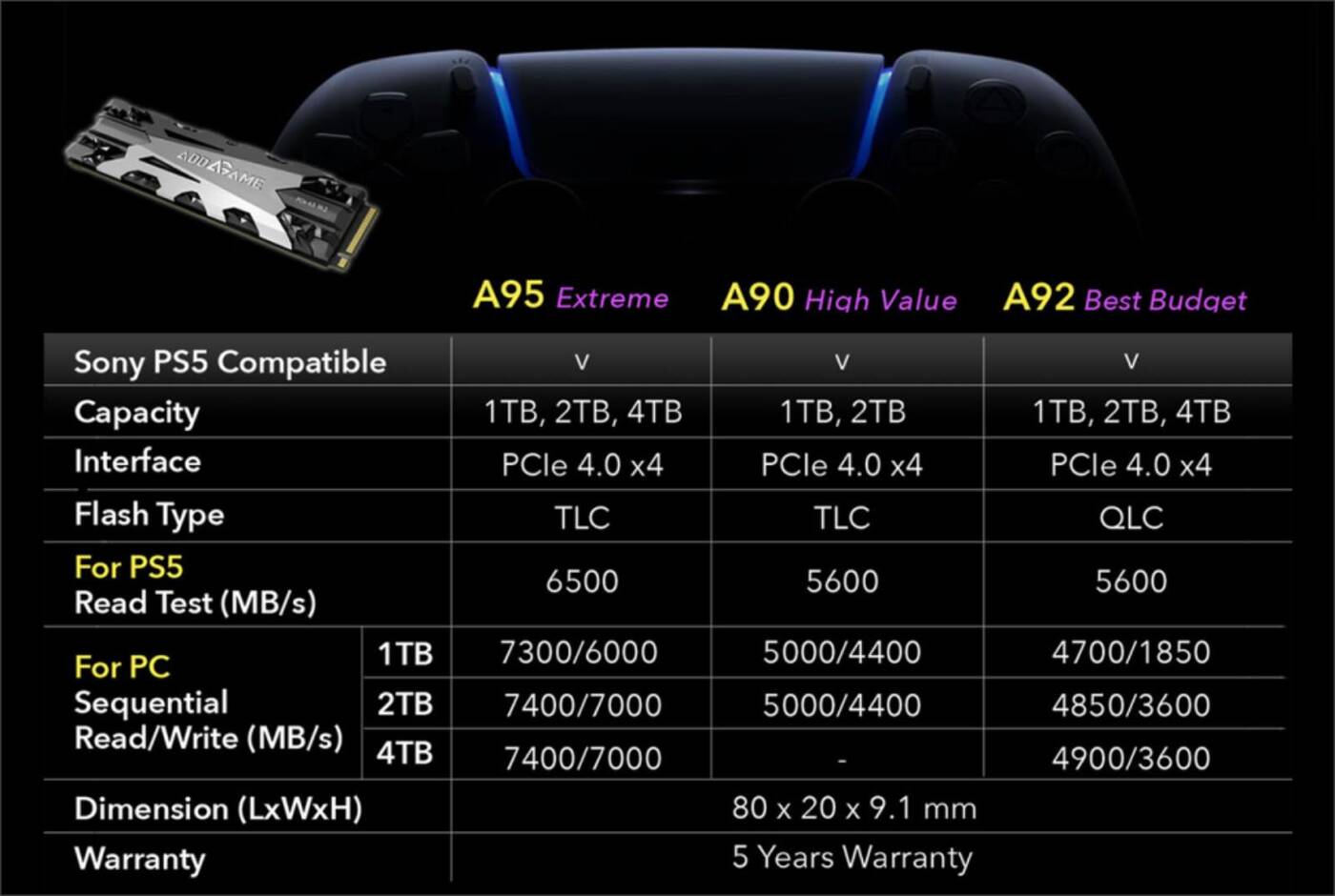 Dyski AddGame A90 firmy Addlink sprowadzają się do modeli o pojemności 1 TB i 2 TB. Bazują na kościach 3D TLC i oferują prędkość odczytu sekwencyjnego do 5600 MB/s na pokładzie PS5. Producent pozycjonuje je jako rodzinę oferującą odpowiednią równowagę między pojemnością, wydajnością, wytrzymałością i ceną.