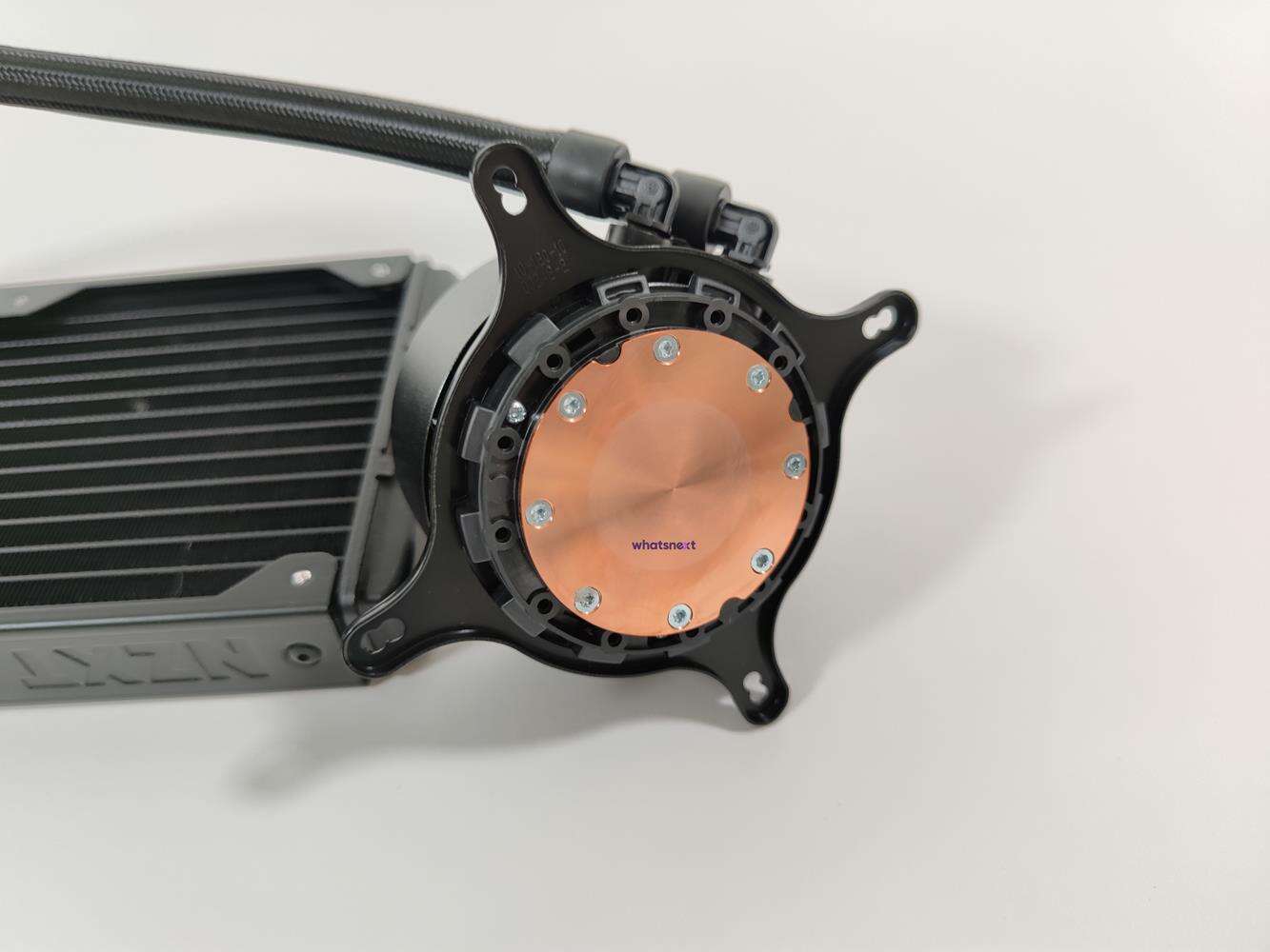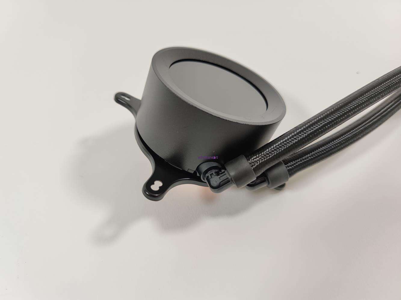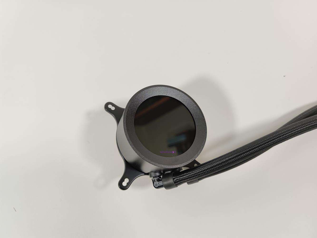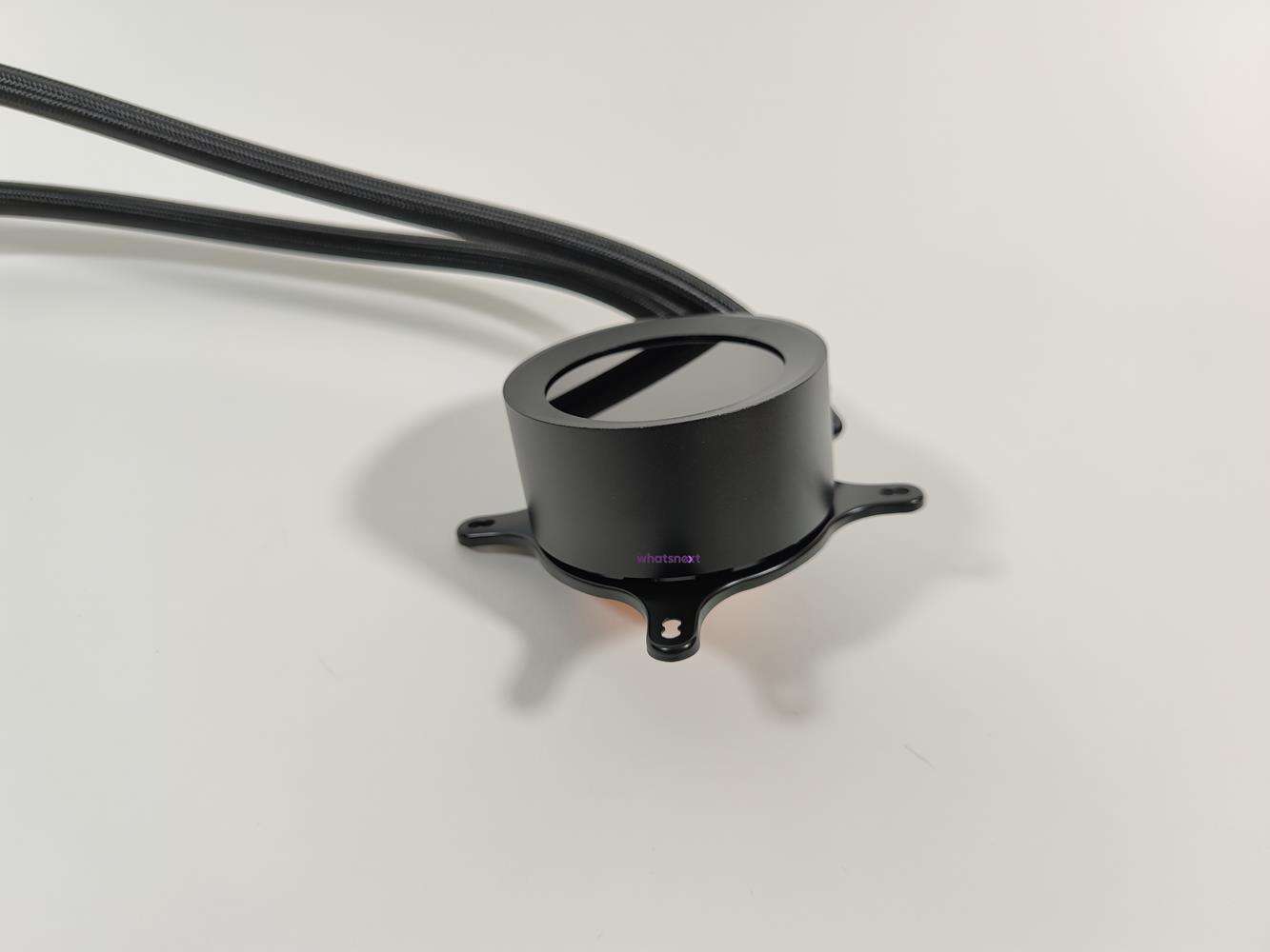 Blokopompka ma na górze wspomniany wyświetlacz. Jego ułożenie możecie zmieniać w oprogramowaniu – skok to 90°. Poza tym blok jest cały czarny, a podstawka miedziana (z fabrycznie nałożoną pastą). Są tutaj też dwa miejsca na kable, które musicie podłączyć aby choćby sterować wyświetlaczem. Pompka pracuje z maksymalną prędkością 2800 RPM.