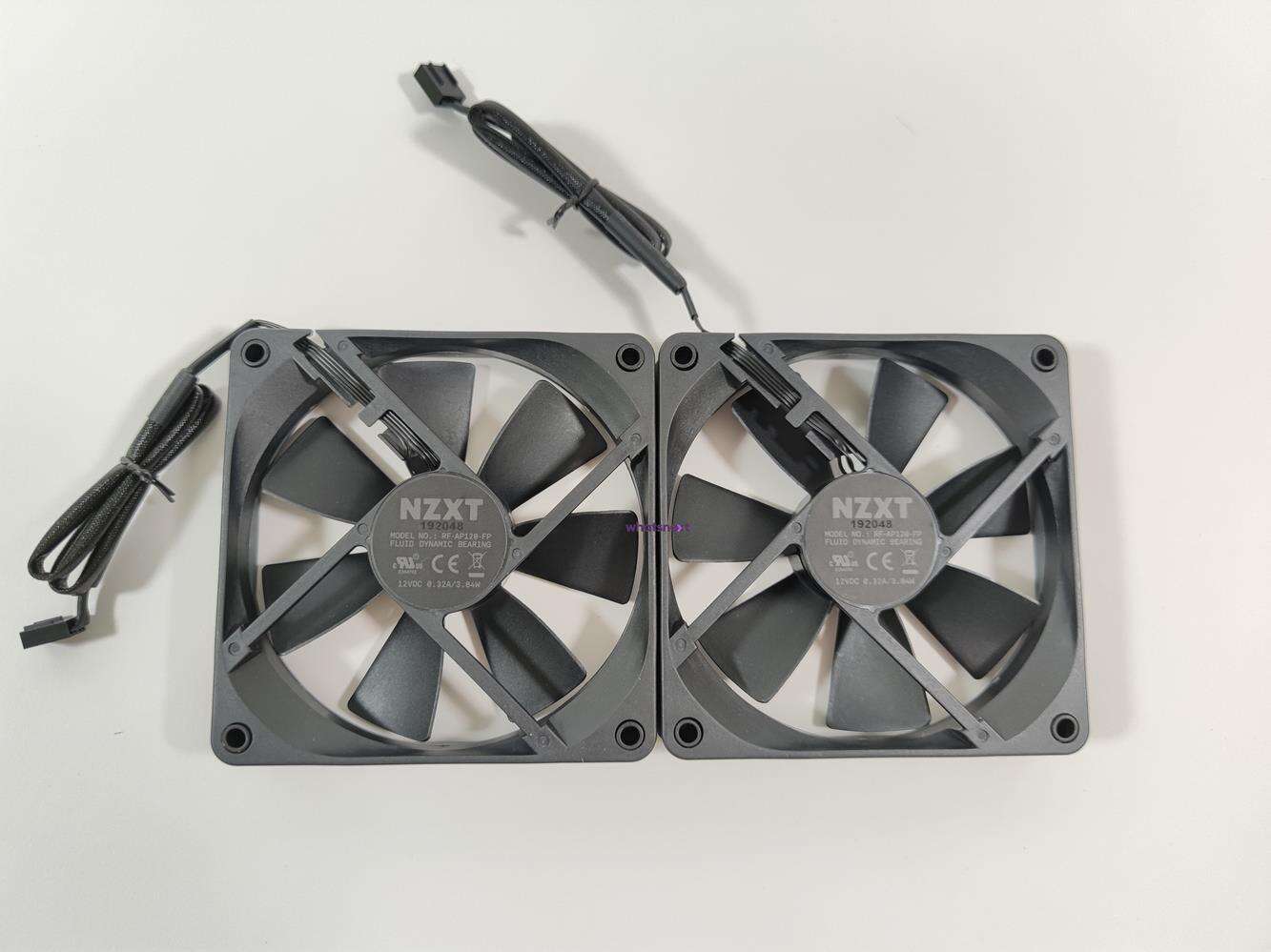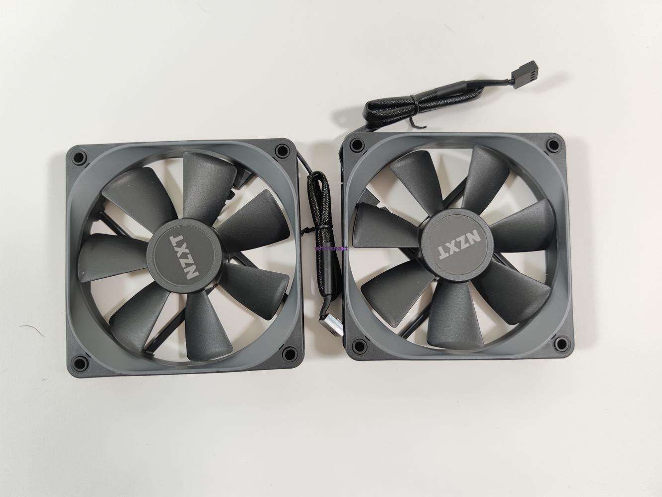 Dołączone wentylatory to modele Aer P120. Ich maksymalna prędkość to 2000 RPM, przepływ powietrza 73,11 CFM, ciśnienie 2,93 mmH2O, a głośność 36 dBA. Śmigła mają złącze 4 pin PWM i możecie je podłączyć bezpośrednio do kabli wychodzących z blokopompki.
