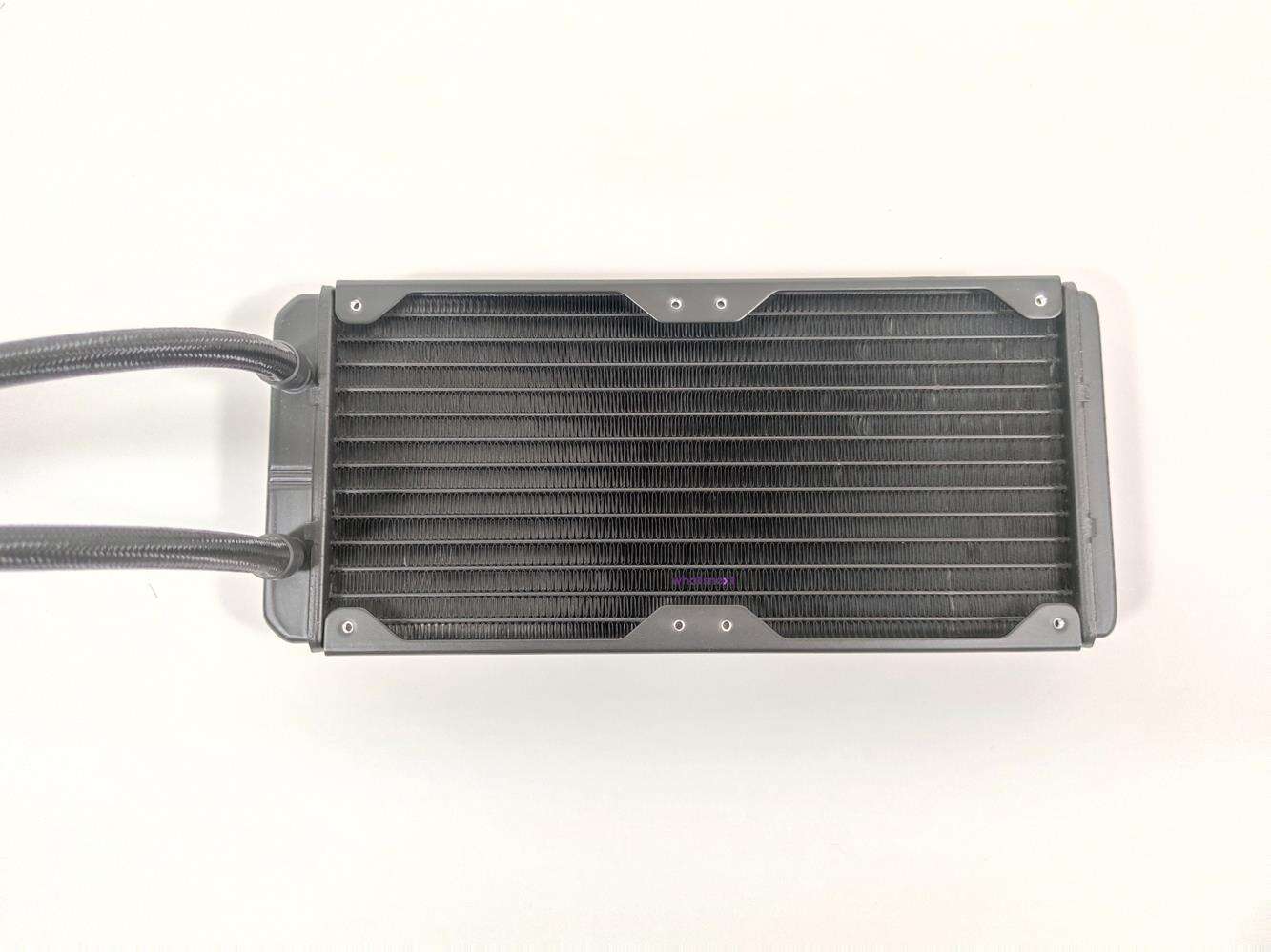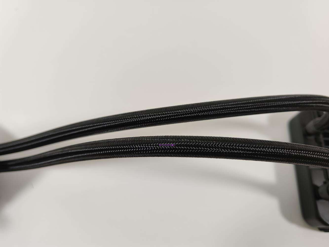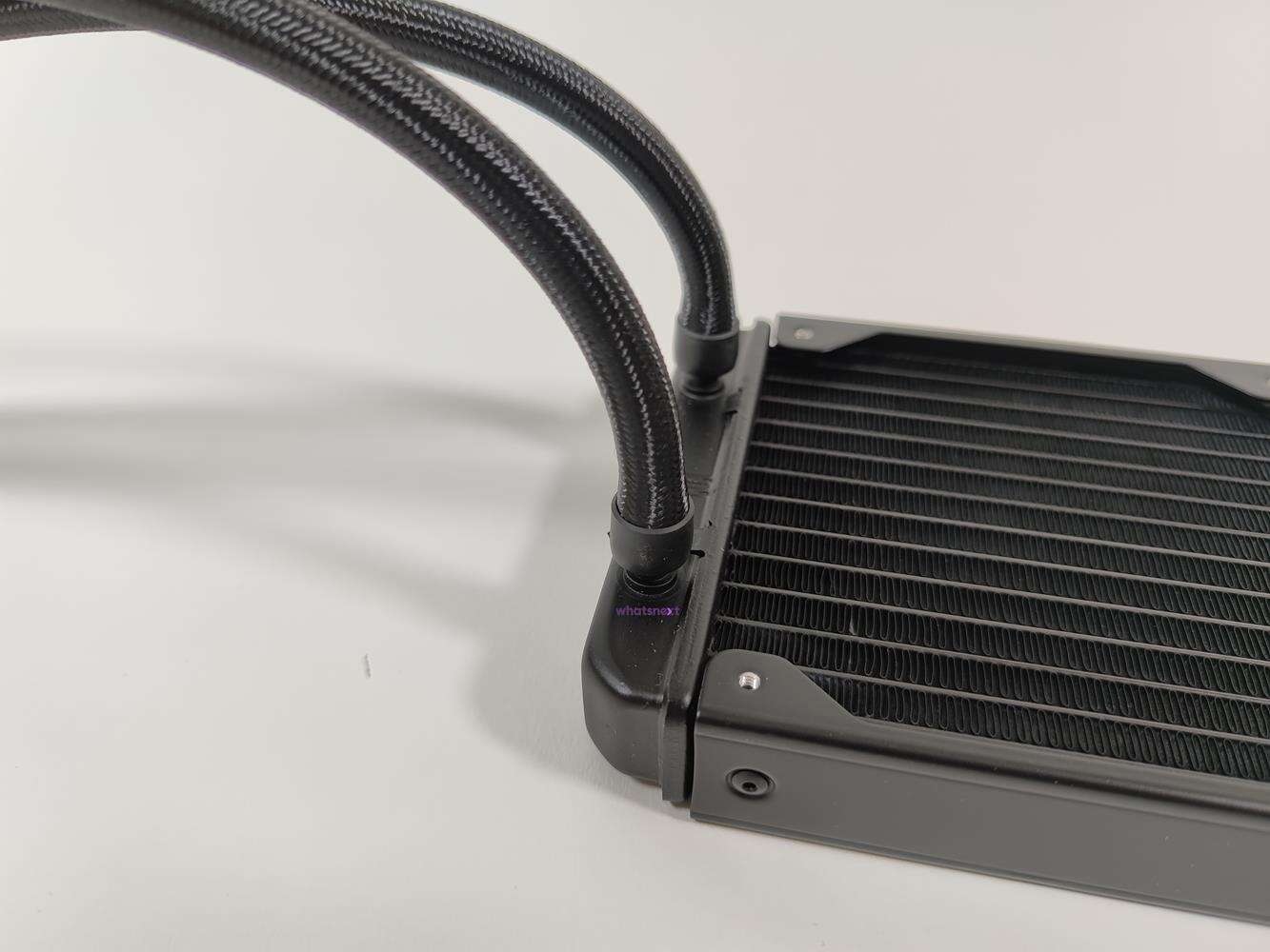 Chłodnica ma wymiary 123 x 275 x 30 mm i jest wykonana z aluminium. Wychodzą z niej dwa węże o długości 400 mm. Są one pokryte nylonem i moim zdaniem są wystarczająco elastyczne. Połączenie z blokopompką jest ruchome. Szkoda jednak, że nigdzie nie ma korka, pozwalającego na uzupełnienie poziomu cieczy w układzie.