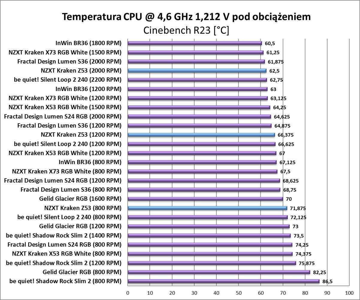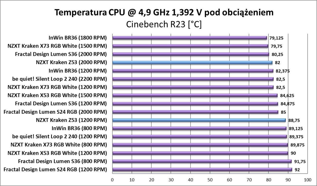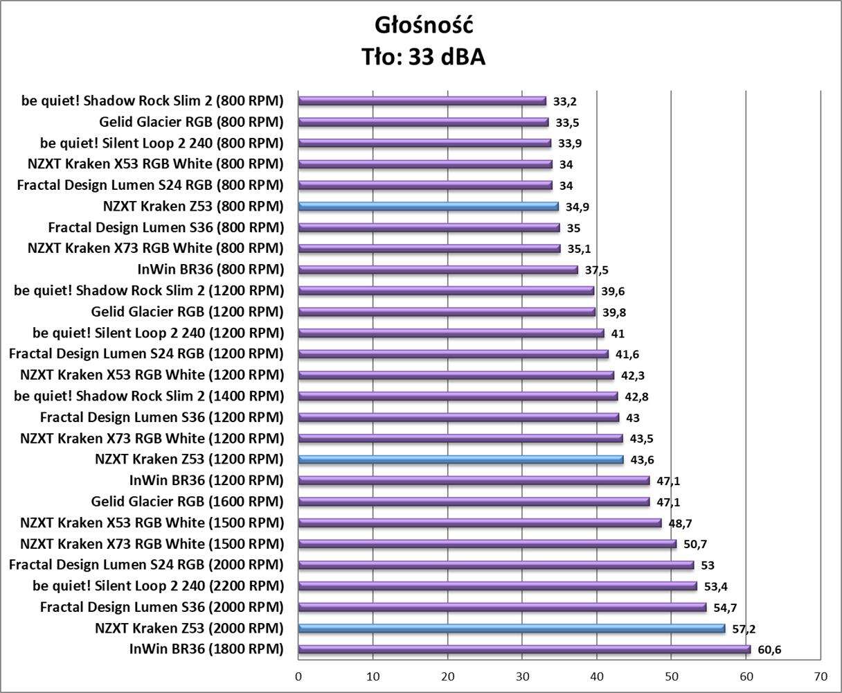 Bez wątpienia NZXT Kraken Z53 oferuje świetną wydajność. Jest ono na czele wszystkich AiO 240 i to na wszystkich obrotach. Bez wątpienia więc możecie liczyć na znakomitą wydajność. Co ciekawe wypada ono też znacznie lepiej niż model X53 RGB. Najwyraźniej zastosowane wentylatory radzą sobie lepiej w praktyce. Świetna wydajność jest niestety okupiona większą głośnością. Na 2000 RPM jest naprawdę źle, na 1200 RPM już znacznie lepiej, ale konkurencja potarfi być cichsza. Na 800 RPM jest już jednak blisko idealnej ciszy.